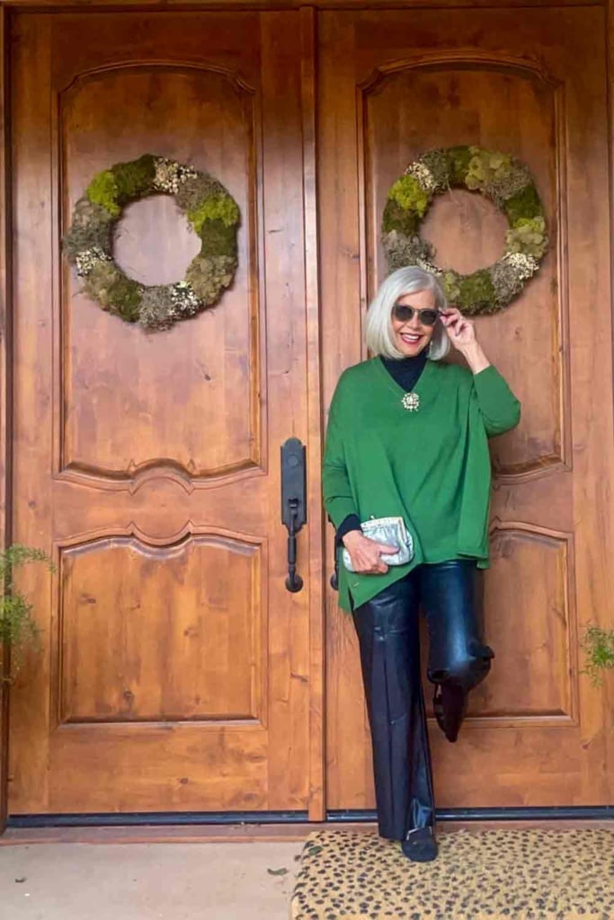 I love that cheerful bright pop of green, with the Mersea sweater! You’ve made it cool and contemporary, with the faux leather pants. Super wearable outfit!