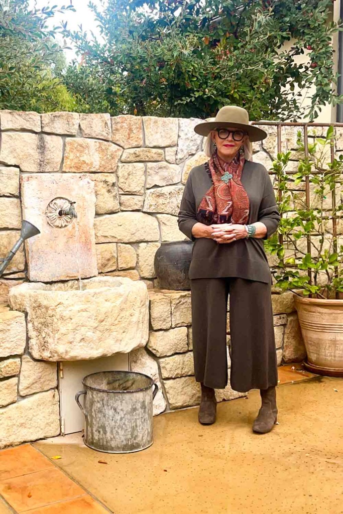 I purchased these two COS knitwear separates this fall. Here I paired them with a favorite vintage paisley scarf, booties, a native American brooch and hat. You can see how I styled this outfit in my post Bespoke Fall Wish List for Women Over 50 who Own Their Own Style. I have been wearing these separates on repeat