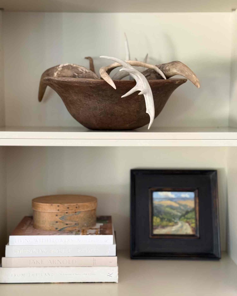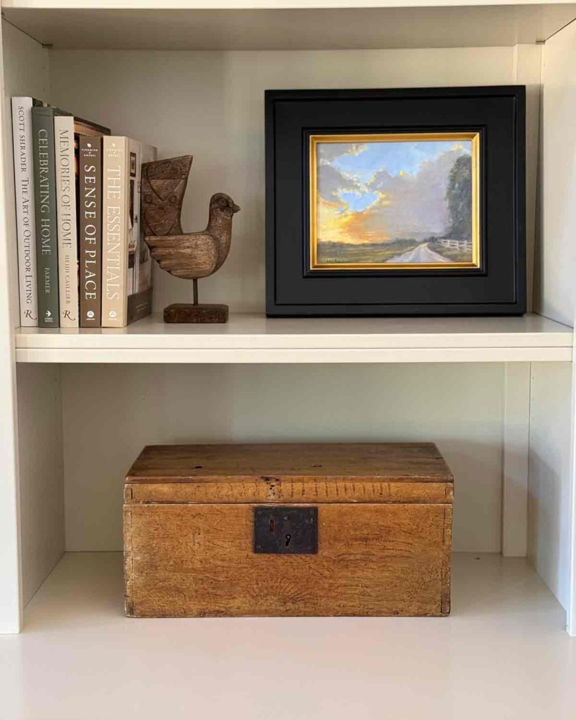 My current approach: a couple of my fave Pat Huber paintings, some of my favorite design books, and a few antique or vintage objects that have a lightness to them. I (we) do have an obsession with decorated antique boxes. I like to move mine around so I can enjoy them rather than leave them in a bedroom that rarely gets used. Move your treasures around. They will find a new life.