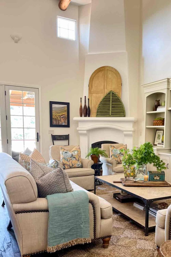 My fireplace in the great room is a bit of a challenge due to its ceiling height. Everything on the mantel needs to be tall. My spring solution has become a set of cupboard doors I pulled from an upstairs storage piece years ago, in original salmon paint on one side and mustard on the other. I flip them from orange to gold depending on the season, and they give the height the space needs without feeling heavy.