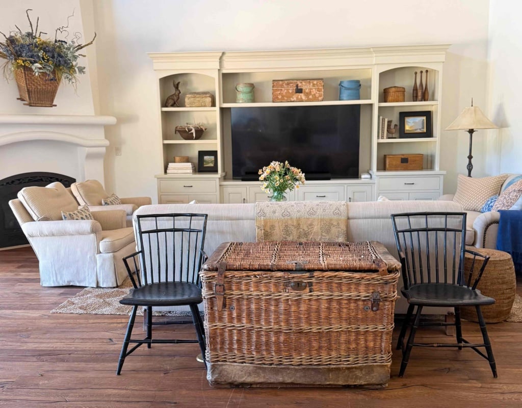 Below are the 12 spring living room decor ideas that have genuinely moved the needle in my great room including this year, with Scout in the picture, who has permanently redefined what coffee table styling means around here.