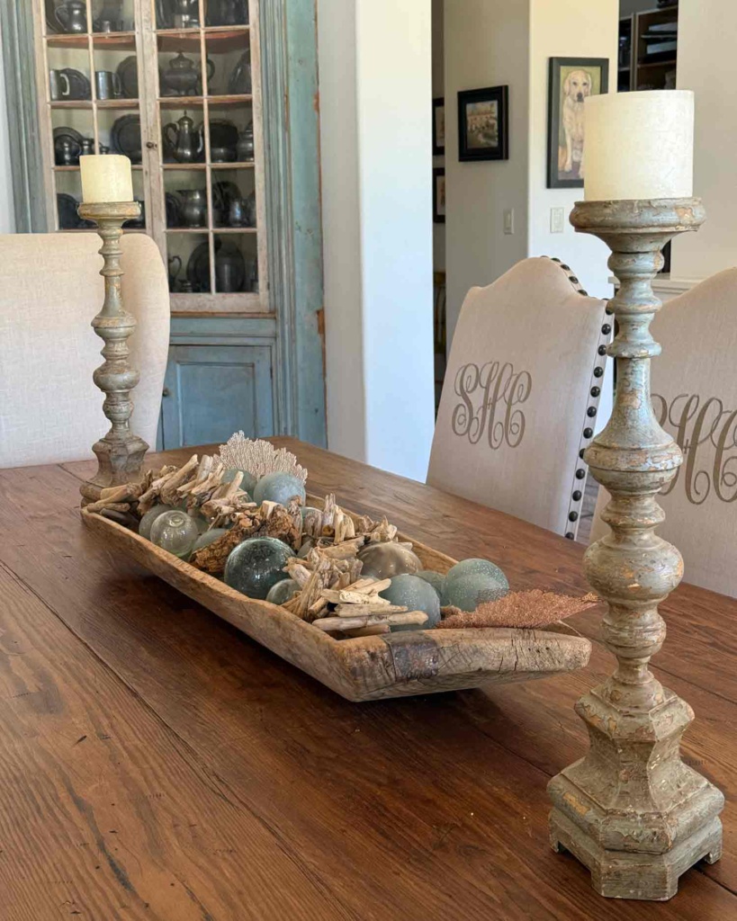 In a great room, the dining area shifts with the seasons too. This spring I added a seaglass and driftwood garland to my antique bowl that always resides at the center of my table.