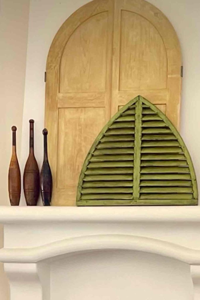 The principle works even if you don’t have my specific quirky doors: find one tall element, add something green, layer a few objects you love. I often add the green vent that migrates around my house, a vintage object or two, and something that says spring without screaming it , my lawn bowling pins, a piece of folk art. This year I added a vintage french pack basket at Christmas. Steve loved it (which is shocking), so I did a mix of dried an faux in the basket for spring