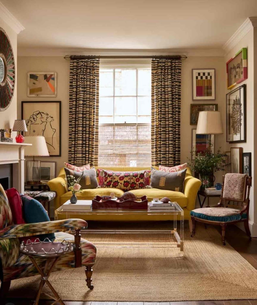 Beautiful example of a collected design by Stella Weatherall. I love everything about this room including the bright gold sofa and the acrylic coffee table (which keeps the room from looking cramped). This space is filled with what looks like art from the owner’s collection, some antiques, an interesting combination of textiles, and artifacts that the owners collected.