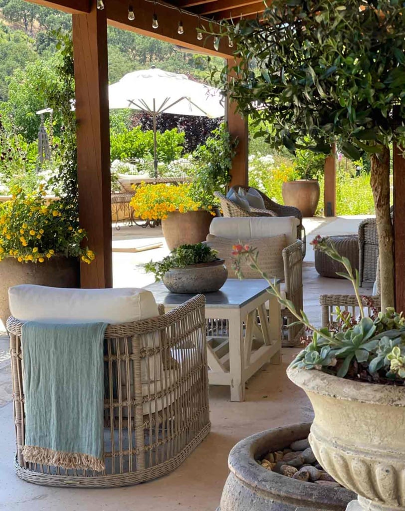 Add comfy throw pillows and blankets (for cooler evenings) for your sofa and lounge chairs to create a cozy and inviting outdoor space. I had my friend Trish Cottage by Design make new pillows in Perennials fabric this year, and I couldn’t resist having her monogram a few. Be wary of any fabrics that aren’t 100% solution dyed acrylic if you have a lot of sun. They will fade. They might be less expensive but they will not last.
