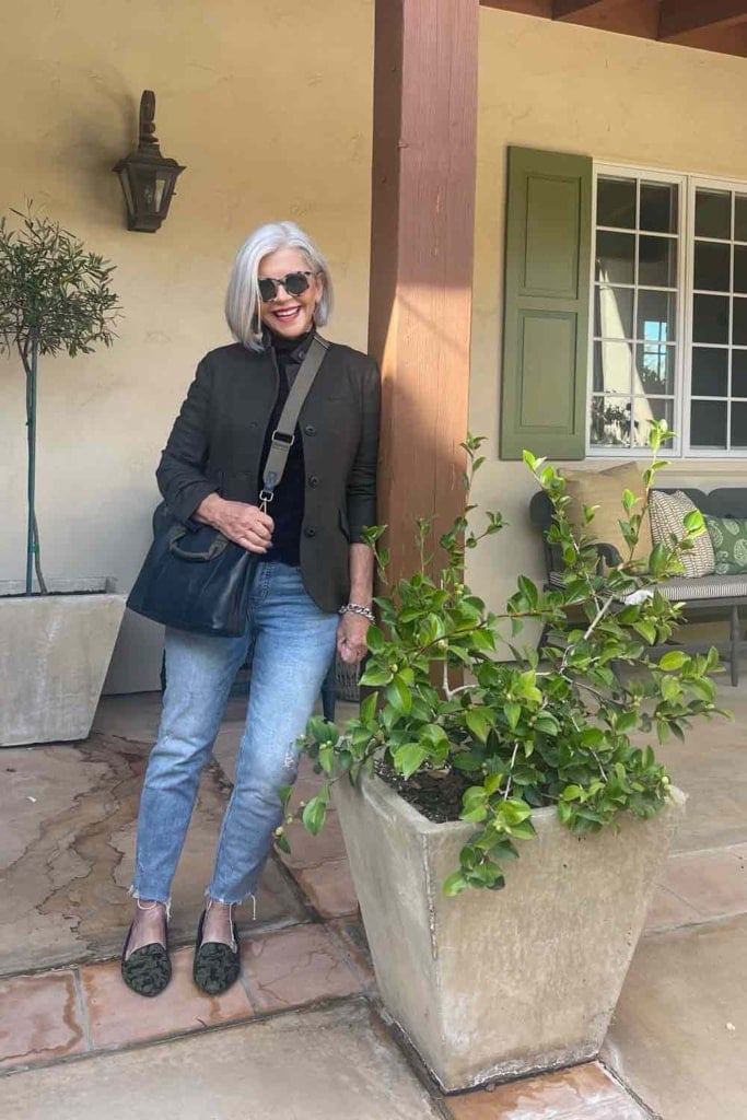 This leather topper is another classic. It can be dressed up or down. I have owned it for at least 15 years probably more. The picture on the left was taken this week, the one on the right several years ago. I styled it with faux leather pants from Lysse, birdies, and a hat from Wyeth. The other photo is a more caual look with a pop of color. You can see how I have styled these jackets multiple ways in my post How to Style Leather After 50 here.