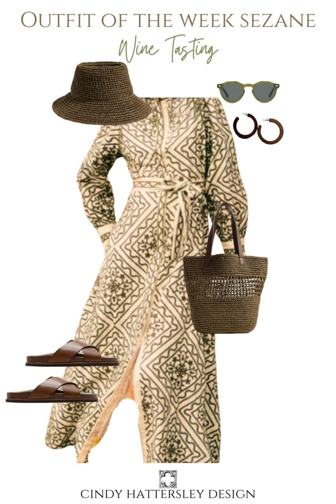 This wonderful dress would be great for a day of wine tasting with sandals, a straw bag & hat from BR Factory, and comfy sandals, and caddis sunnies that are on my list.