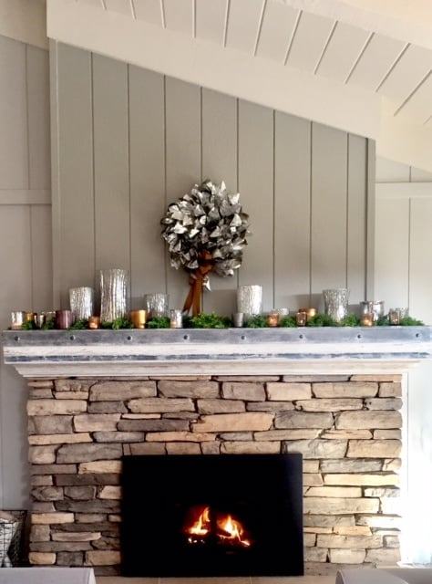 On the fireplace mantel are more votives of all sizes from Roxanne’s collection. She has gathered them from small boutiques to Home Goods.