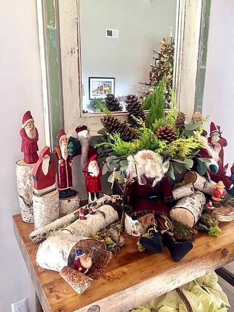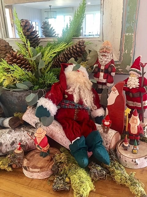 Christmas scenes meticulously styled are in every nook and cranny. Here is a collection of Santas nestled amongst moss and birch.