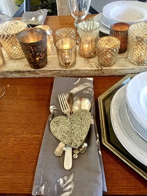 Roxanne is a master at tablescaping. Those of you from our area have seen her work at many charity events. I love the combination of the old silver flatware with the german silver heart.
