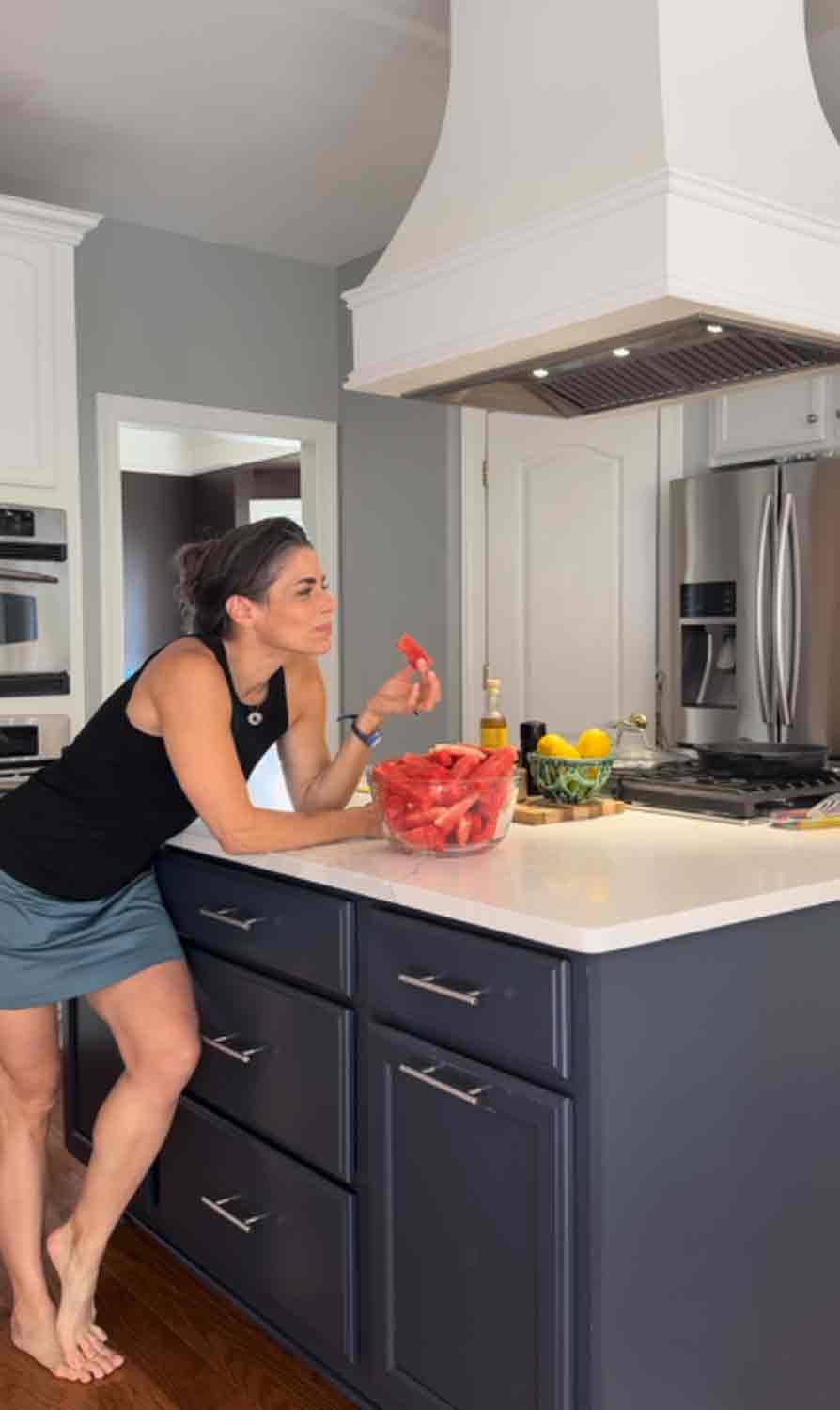 I’ll walk my dog first thing (early morning sun exposure) and then the next hour is consumed with tasks: getting my kids to where they need to go (camp or school). I also like to post in the mornings on IG & TT, so I focus on that, while hydrating and drinking a pre-fuel vanilla latte.
