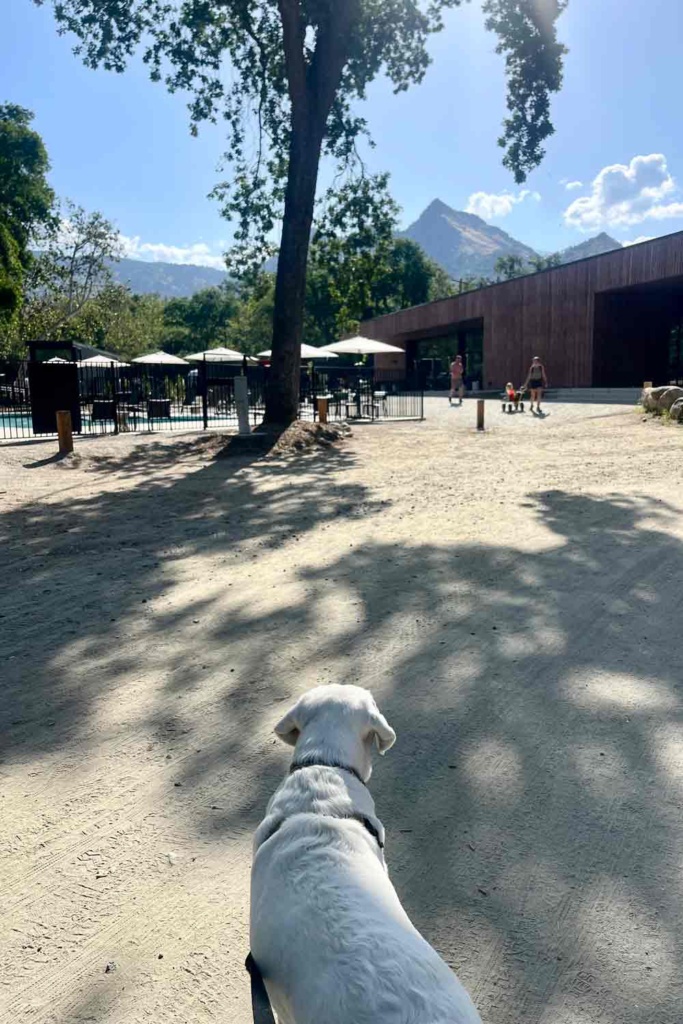There are some trails that dogs are not allowed on but they are welcome otherwise. We just took turns babysitting!