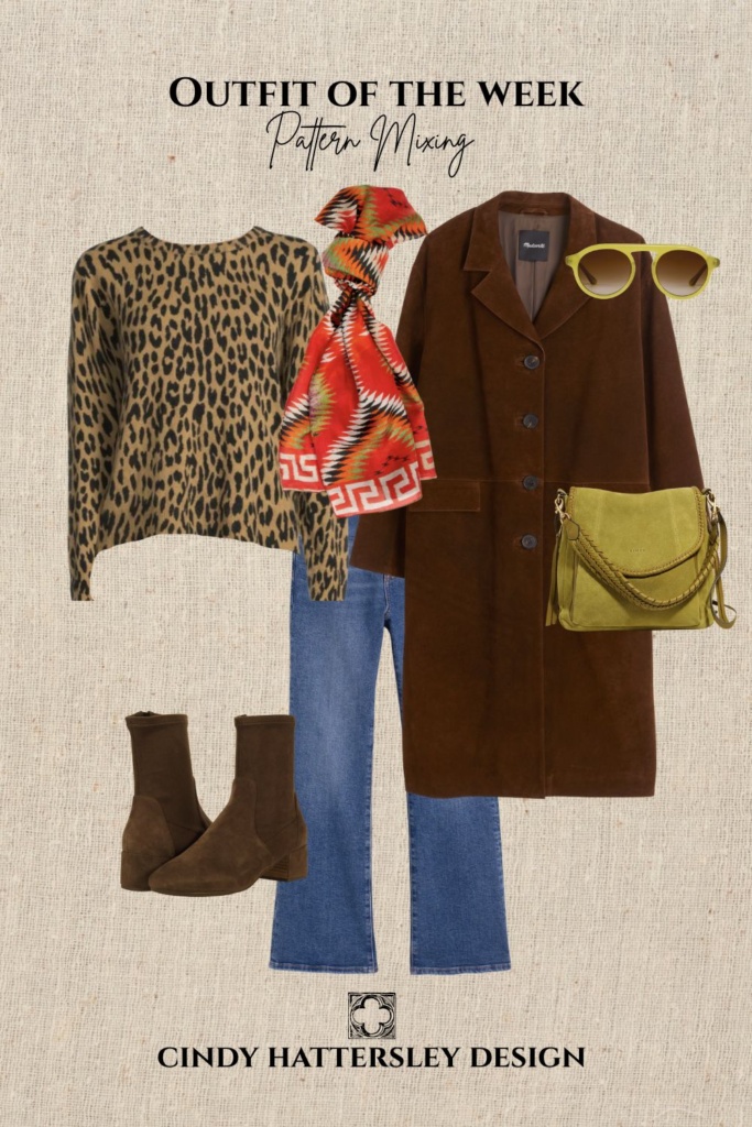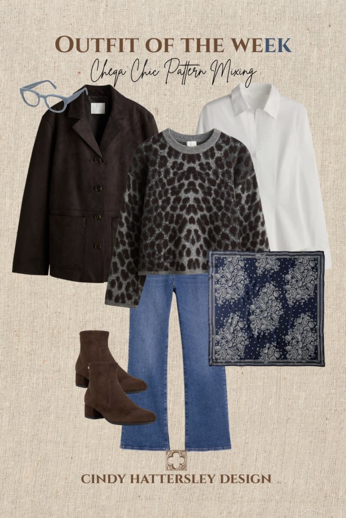 I have mixed up looks from Nordstrom Rack, Loft, and H&M for this look. Faux suede jacket, leopard sweater, white shirt, silk scarf, jeans, glasses,and booties.