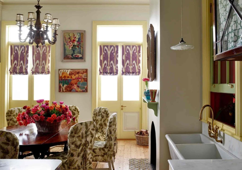 I could never be as bold as Anna with color and pattern in my own home. I can tire of pattern and too much color, but I am endlessly inspiried by those who do. This breakfast area is so charming. Love the bold mix of fabrics. I assume from Anna Spiro Textiles where you can find her fabrics and companion wallpapers.