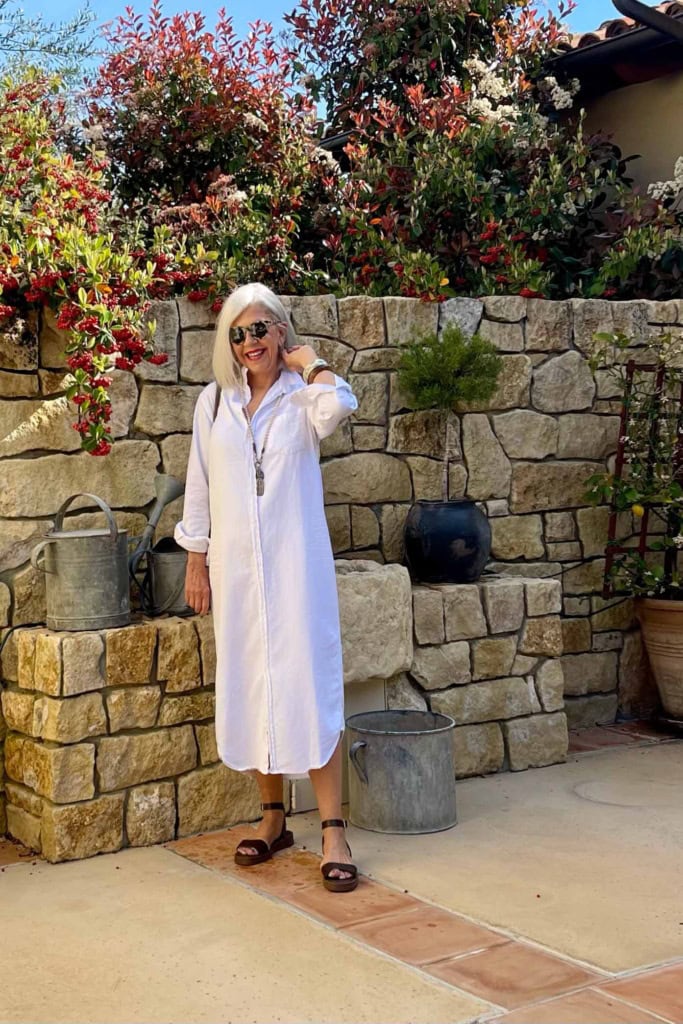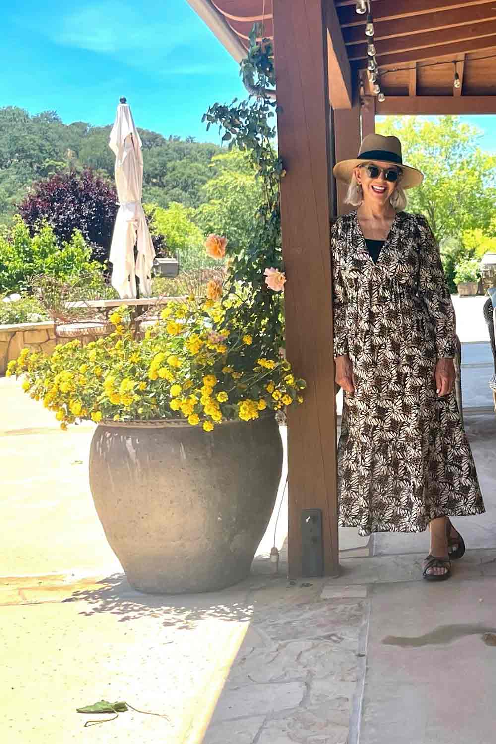Mature women need to choose carefully and wisely (I have learned this one the hard way). Focus on the right fit, flow, and fabric. Gauze, linen, linen blends, and poplin styles are cooler than synthetics. Bold floral patterns may not be your best friend.