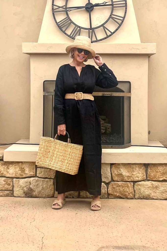 I wear this Quince dress as a coverup or belted for a day out. It is a wardrobe warrior. I love a dress that wears “several hats”. I would also pair it with sneaks and a baseball cap for a trip to the farmers market.