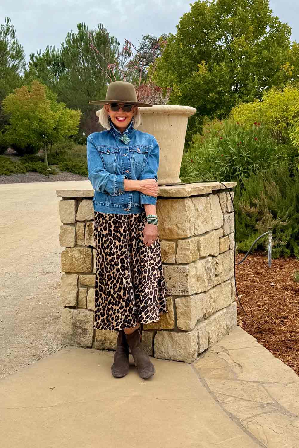 I paired this fun leopard skirt from Talbotswith my trusty icon jean jacket from Gap, gigi pip hat, gentle souls booties, and turquoise jewelry from my collection.
