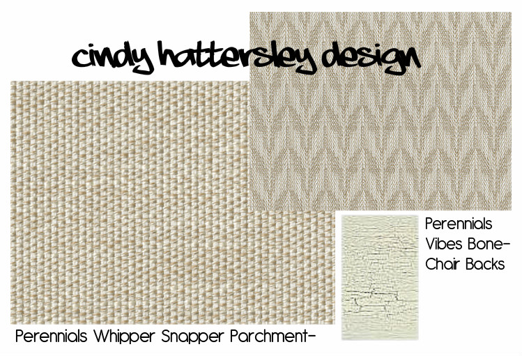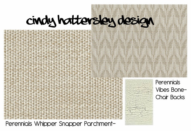 The house has an open plan and the dining area is off to the right. Sylvia has some “crackle finish” dining chairs that are upholstered in a heavy tapestry that have become dated. Repainting the chairs was cost prohibitive so we are going to give them a fresh modern look with some crisp Perennial fabrics. The front seat and back will be covered with Perennials Whipper Snapper in Parchment so Sylvia can use patterned or plain dinnerware. The outside backs are being covered in Perennials Vibes in Bone to add a bit of interest.