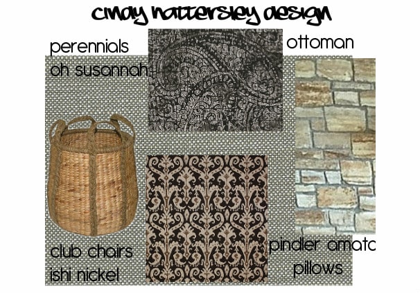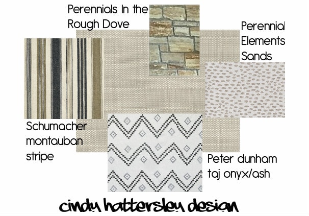 On the left they have a lovely local stone fireplace that reflects the colors of the sand and rocks. Here are the fabrics we selected for this area. Four large club chairs are being recovered in Perennials Ishi Nickel. The large ottoman/coffe table is being recovered in Perennials Oh Susannah for durability. The lumbar pillows will be in Pindler Amato.