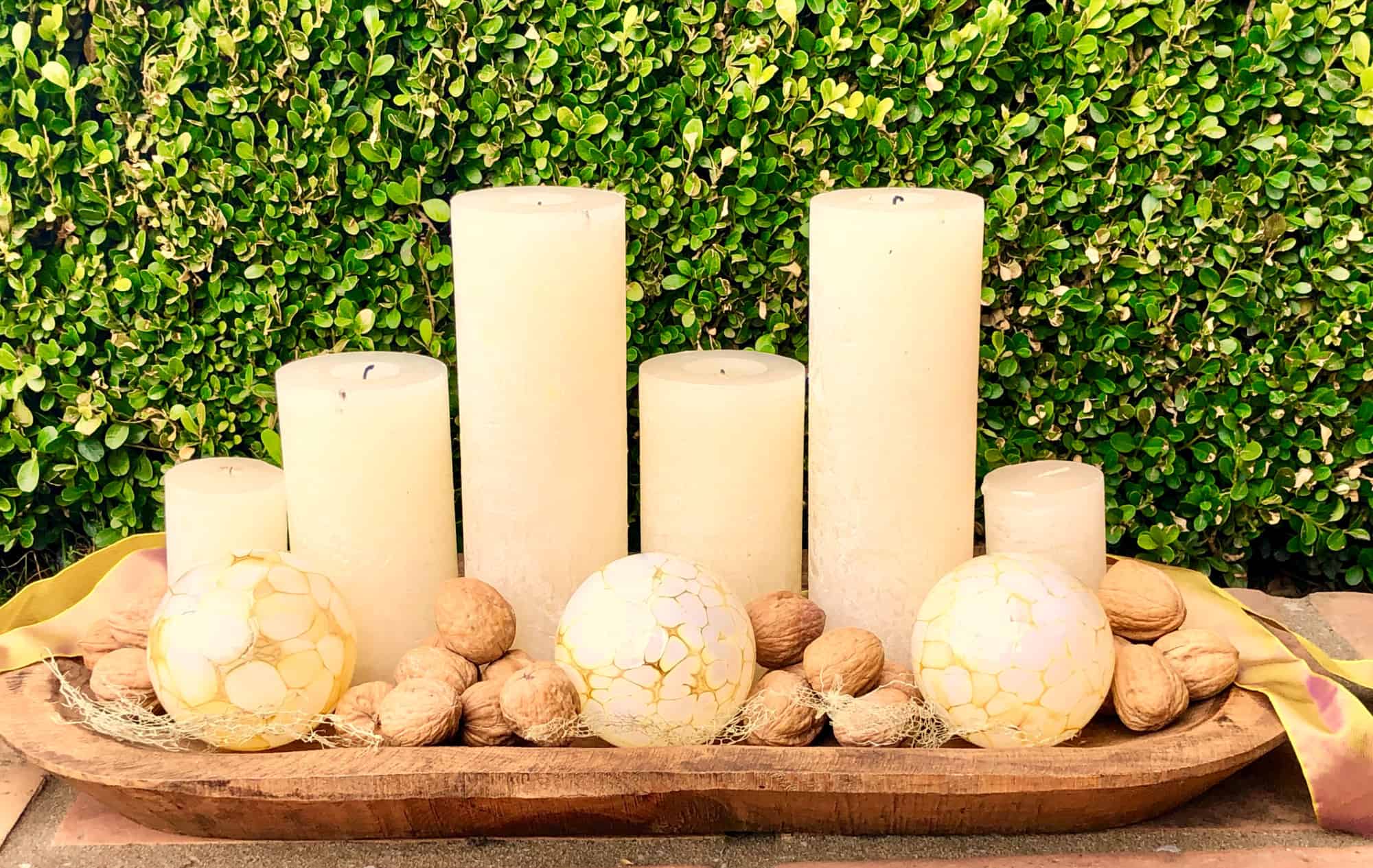I have done so many Christmas tables over the years for different events. Lately, I have enjoyed thinking outside of the box when it comes to Christmas colors and decor. I often do neutrals in my dining room. I like the simplicity of plain white candles in a rustic bowl with walnuts, these luscious mother of pearl art glass ornaments , and a little Spanish moss.