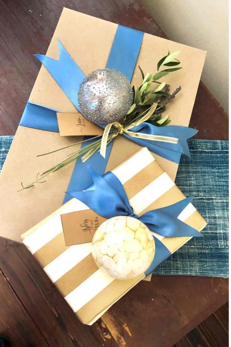 Almost every year I incorporate simple kraft paper, gift boxes or butcher paper into my wrapping paper mix. It is earth friendly, inexpensive, and nearly every color of ribbon compliments it. I usually add embellishments (I am not a huge fan of bows), such as a bit of foraged greenery, berries, a simple wreath, perhaps monograms,cinnamon, or a bit of glitter, Attach with hot glue if necessary.