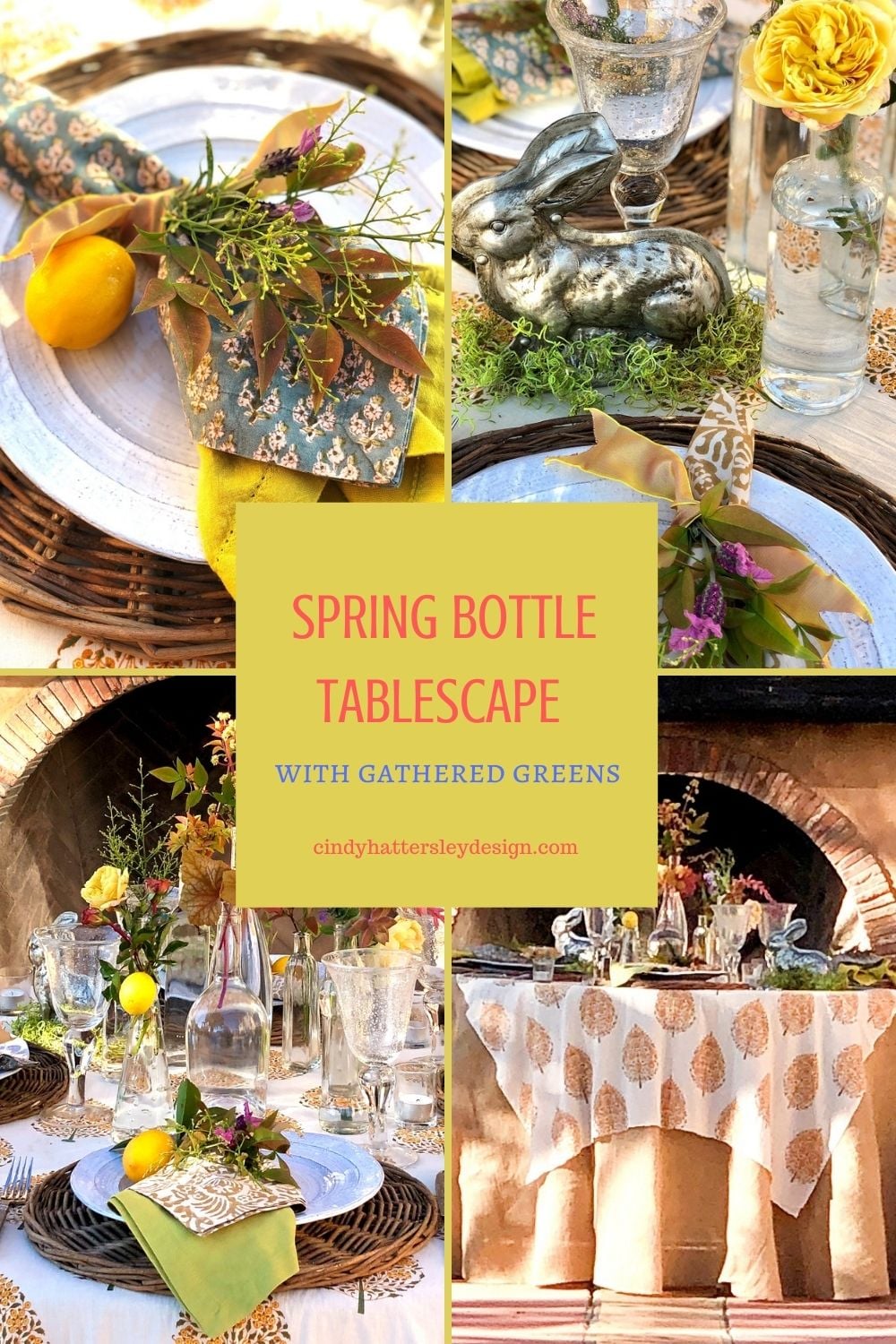 The great thing about an easy to create spring bottle tablescape is you can always forage things to use and you don’t need a lot of material to create a pretty effect. It’s all about choosing different elements to make use of many different colors. Spring is all about fresh florals and greenery, so the more you can find and use, the better.