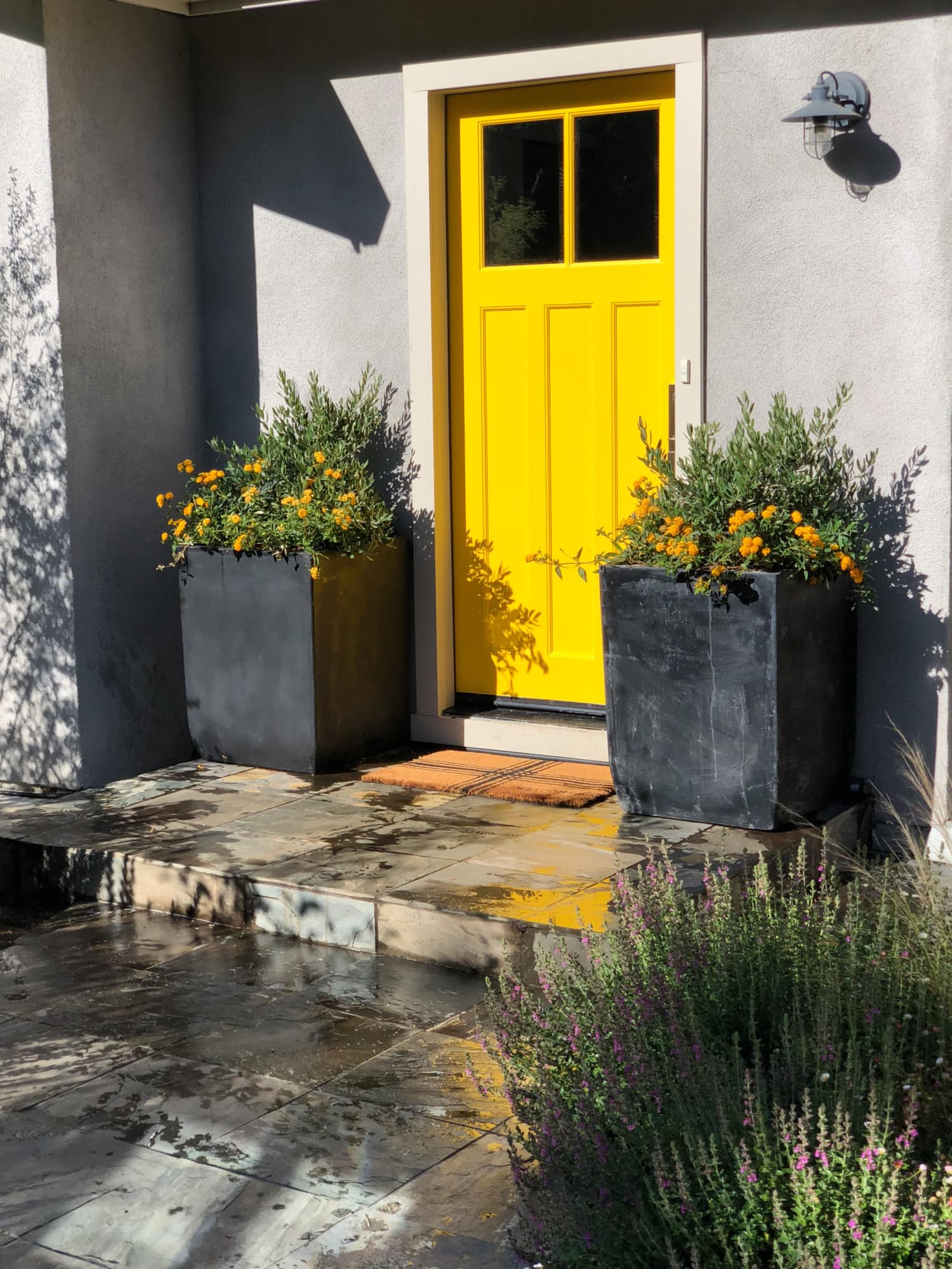The front facade of the house has zero character. When I let them know we were doing this post, (even though they have a six-week-old baby) they jumped on board. They decided to paint the front door yellow to add a little pizazz to the entry. Darius has a great resource where he finds discounted patio pots. He found these black ones and they filled them with little ollies and yellow lantana. They added a Coir Door Mat from the Magnolia Collection at Target for $12.99. They want to add two larger light fixtures down the road.