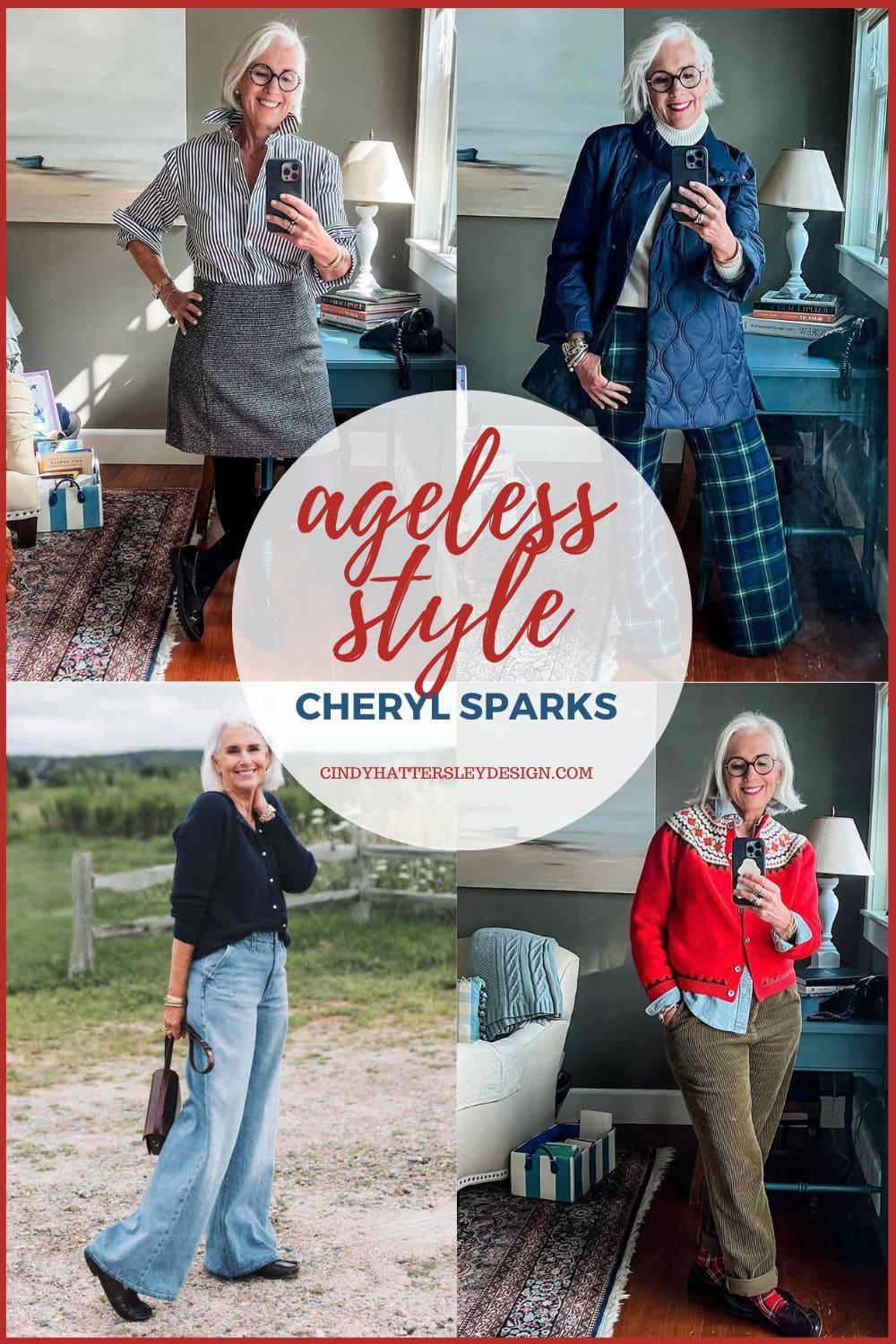 Today I am joining my friend Brenda from 1010 Park Place for our monthly Ageless Style Interview. I am delighted to interview “my IG friend” Cheryl from If It’s Tuesday. Every Tuesday Cheryl shares a favorite outfit on her Instagram feed. I love Cheryl’s “classic with a twist” style. Cheryl and I share a love for jeans, wide legs, and long skirts. I think you will get inspired by silver haired Instagram beauty Cheryl Sparks.