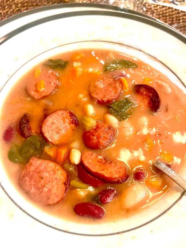 I am sure you know by now, I am a soup fan. We had dinner at my friend Linda’s lovely home a couple of weeks ago and she fixed this delicious Three Bean Sausage Soup.