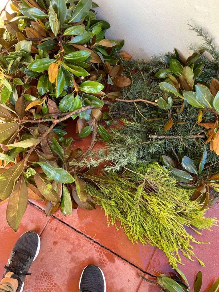 Here is what the wreath looked like. Here is my pile of foraged greens, magnolia, and olive.