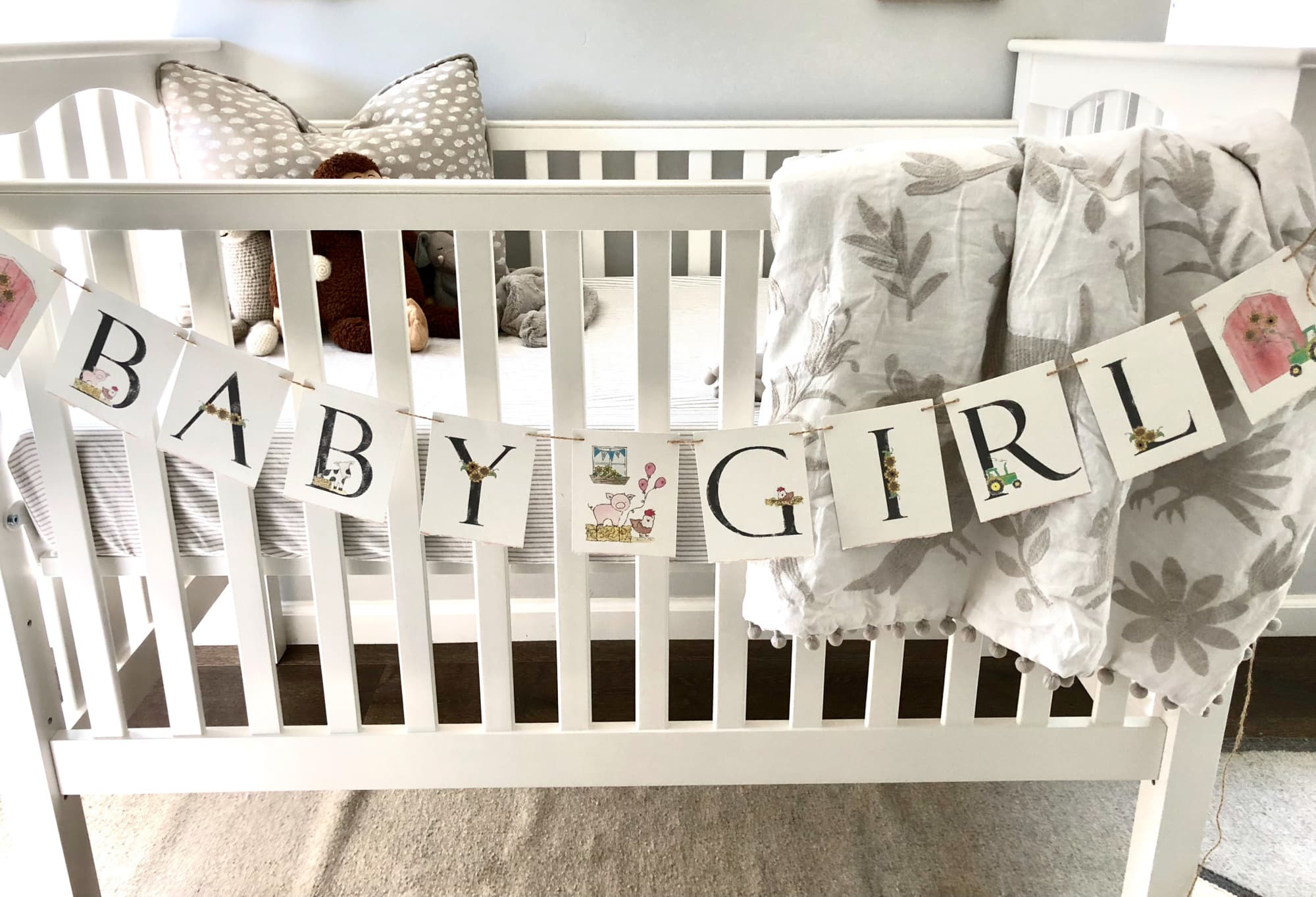 Jenna hates pink and too much frou frou so a gender neutral scheme was her obvious choice for Summer’s nursery. FYI the darling banner (from Etsy) was from Jenna’s shower that her friends threw for her. We couldn’t resist hanging it on the bed temporarily.