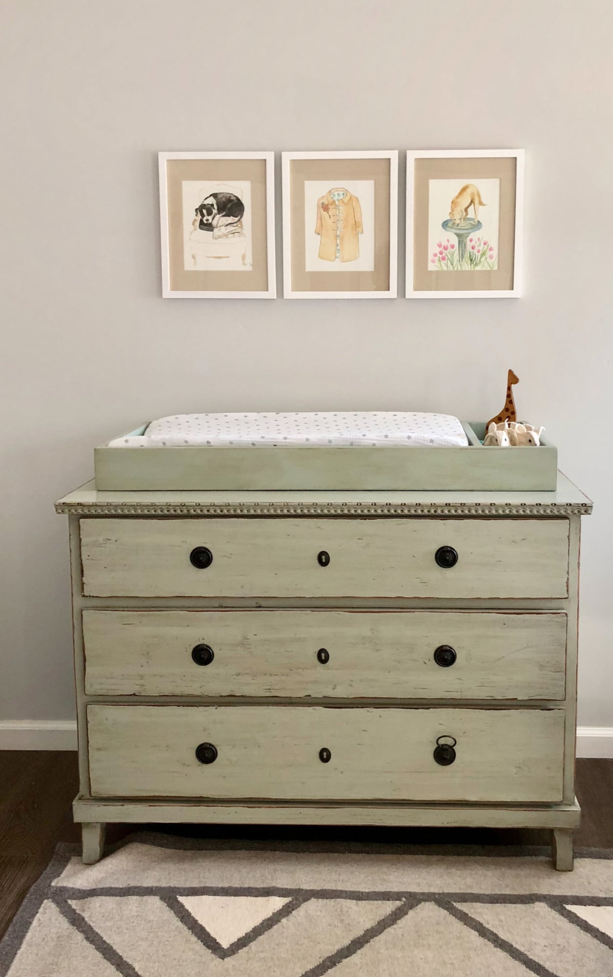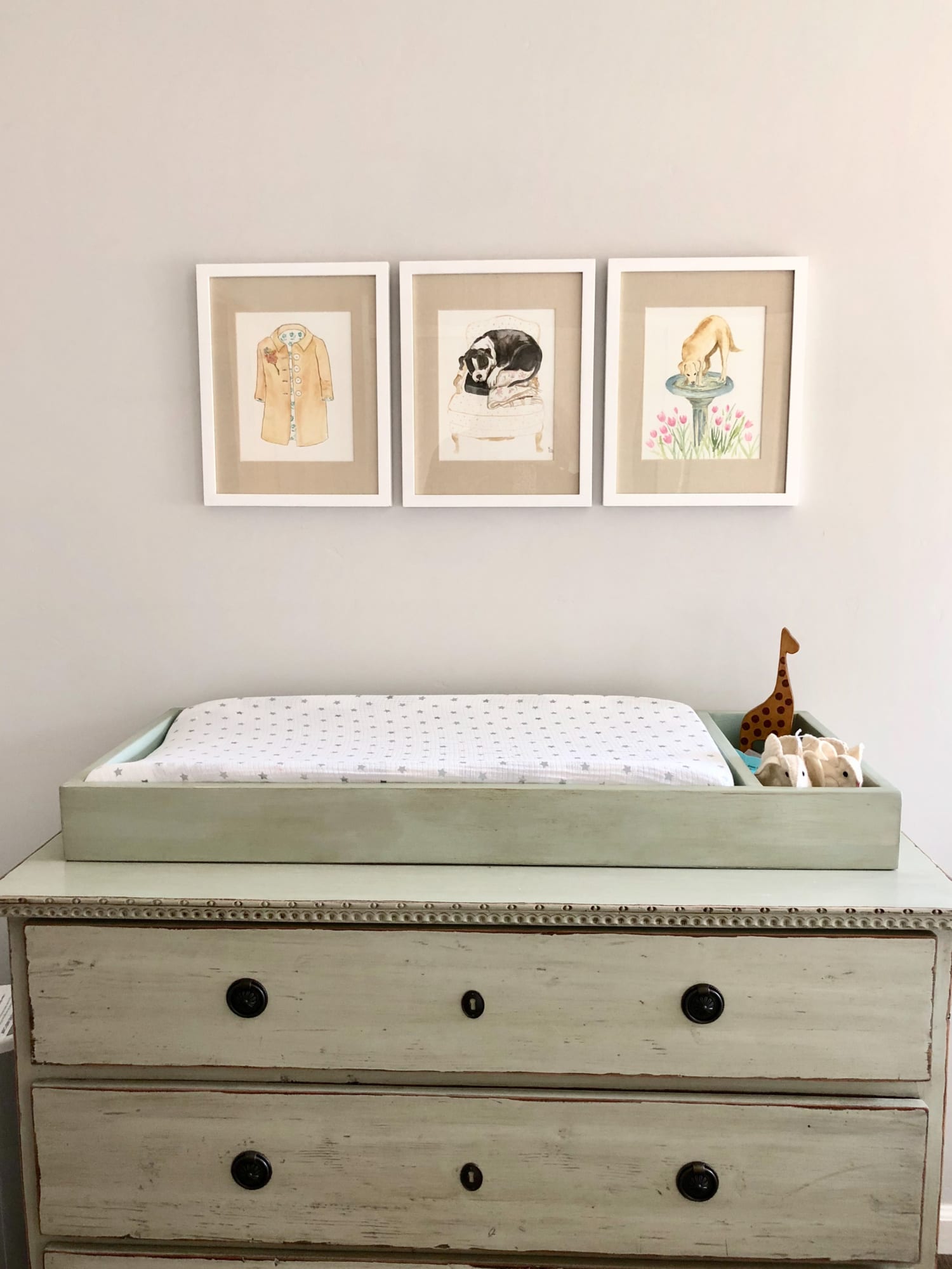The artwork above the changing table/chest is by Katie Baker (who fabricates my slipcovers). You can see more of Katie’s work on Instagram here. The picture on the far right is a rendition of Beau’s stint drinking out of the birdbath in my garden. If you do Pinterest you have probably seen it.