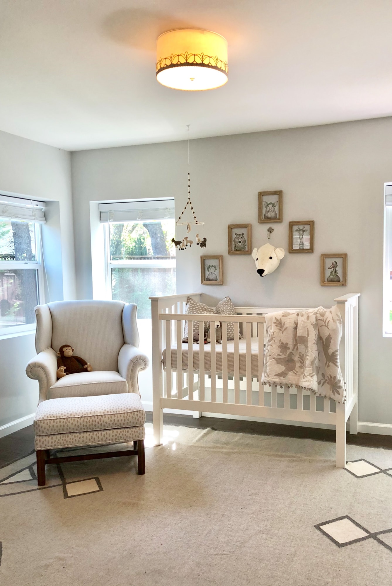 You can add a pop of color in pillows and or artwork that can easily be changed out with the next child. Jenna thought she wanted a pop of color but decided she liked the calm serene feel of the neutral environment. She can always add color later.
