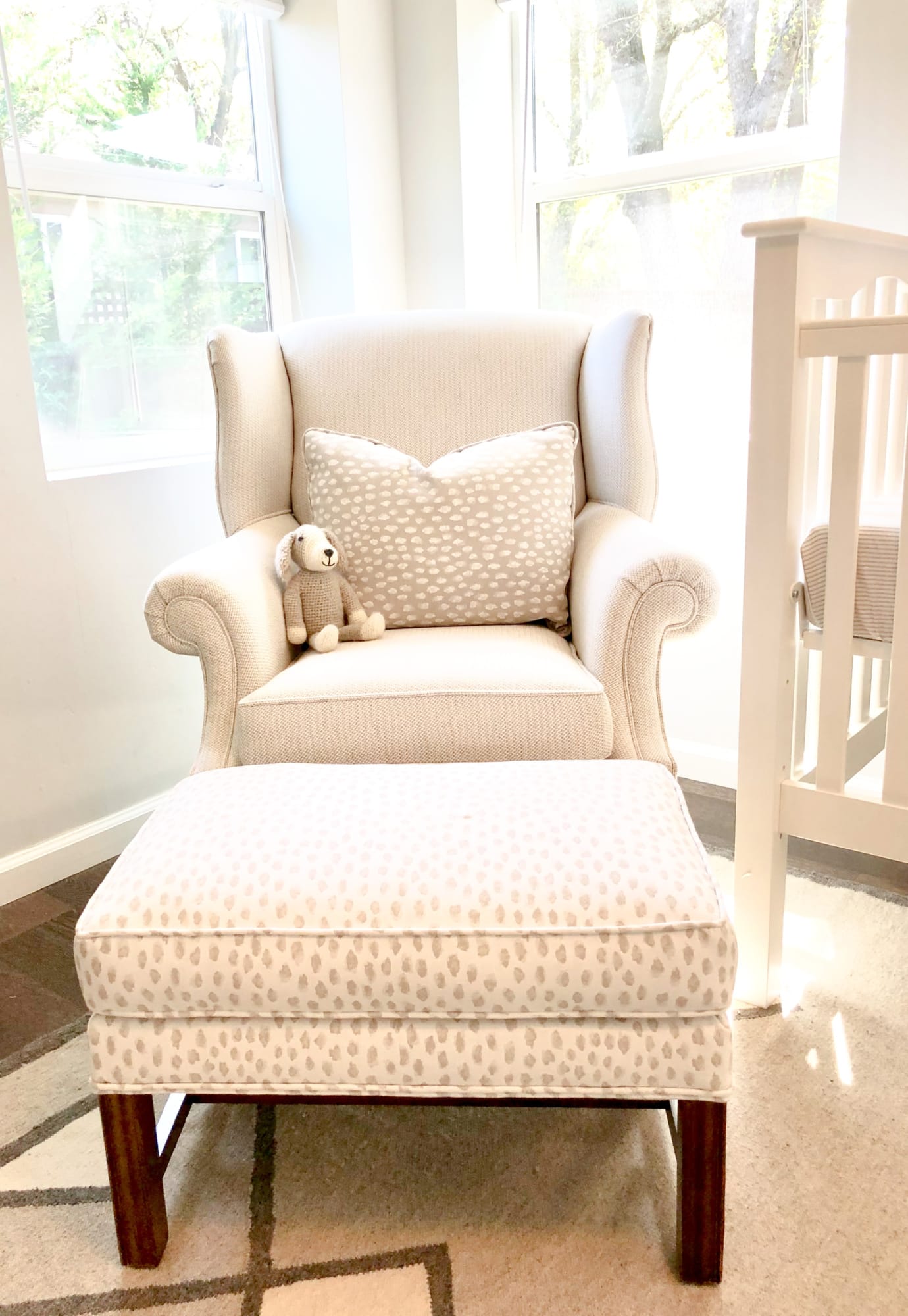 The wing chair was an old leather chair of ours. It was in our house, then moved to our son’s house and he passed it along to Jenna & Darius. It sat in this same room before Summer. Our son and daughter in law and Steve and I had it recovered in a practical Perennials Nit Witty Dove fabric as a baby gift for them. We avoided covering it in something too childlike. The ottoman is in one of my favorite Perennial fabrics, Elements White Sands. Note this fabric is totally reversible. The same fabric is in the reverse on the pillow. The chair could easily be moved to the Living Room when it is no longer needed in the nursery. The ottoman could be inexpensively recovered.