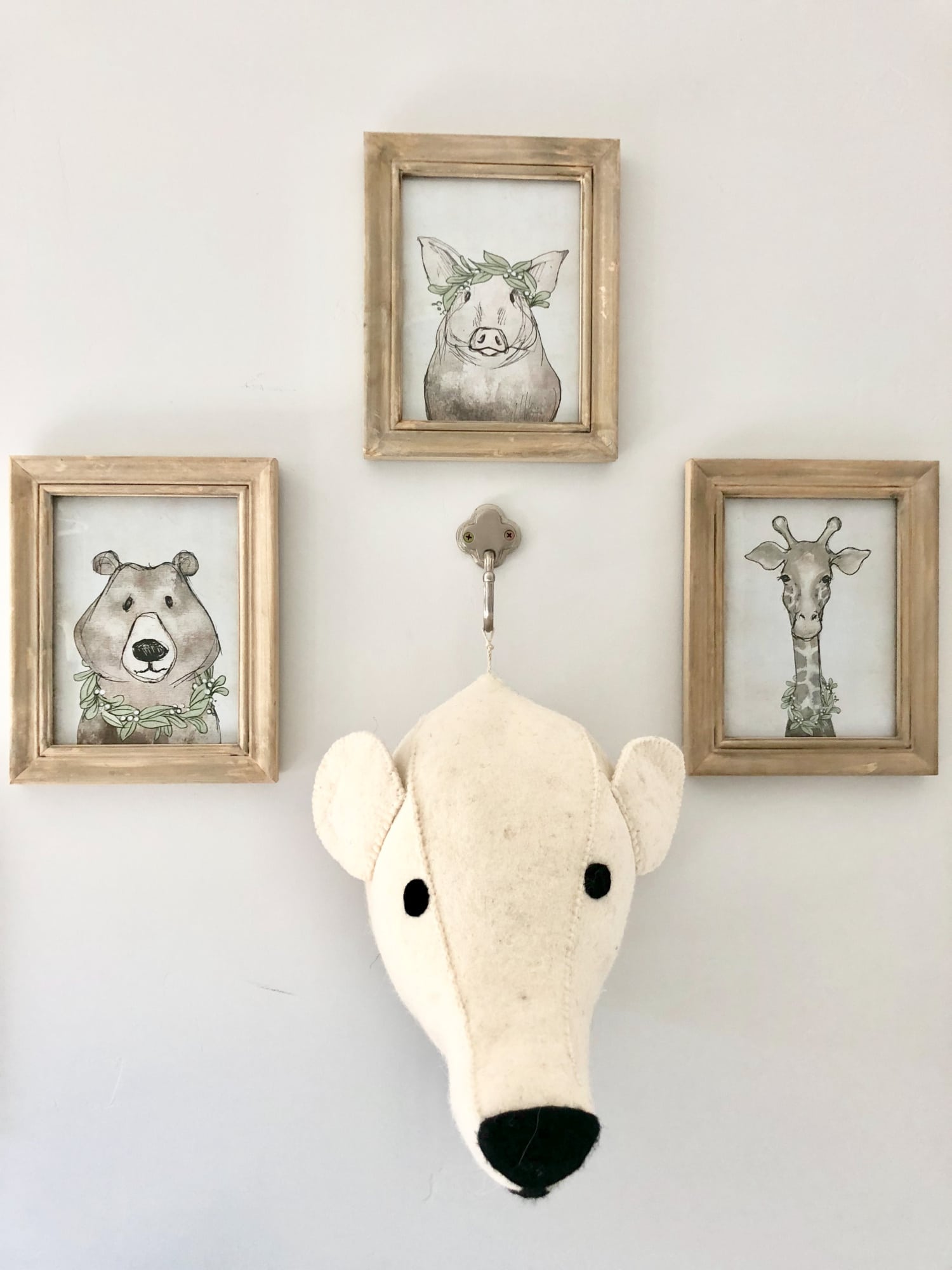 The pictures from Creative Coop above the bed were budget friendly. The mobile and bear trophy came from Bijou on the Park in Paso Robles. If you aren’t local you can find the felt animal mobile here. The felt bear trophy head is no longer available online but you can find the elephant on Amazon