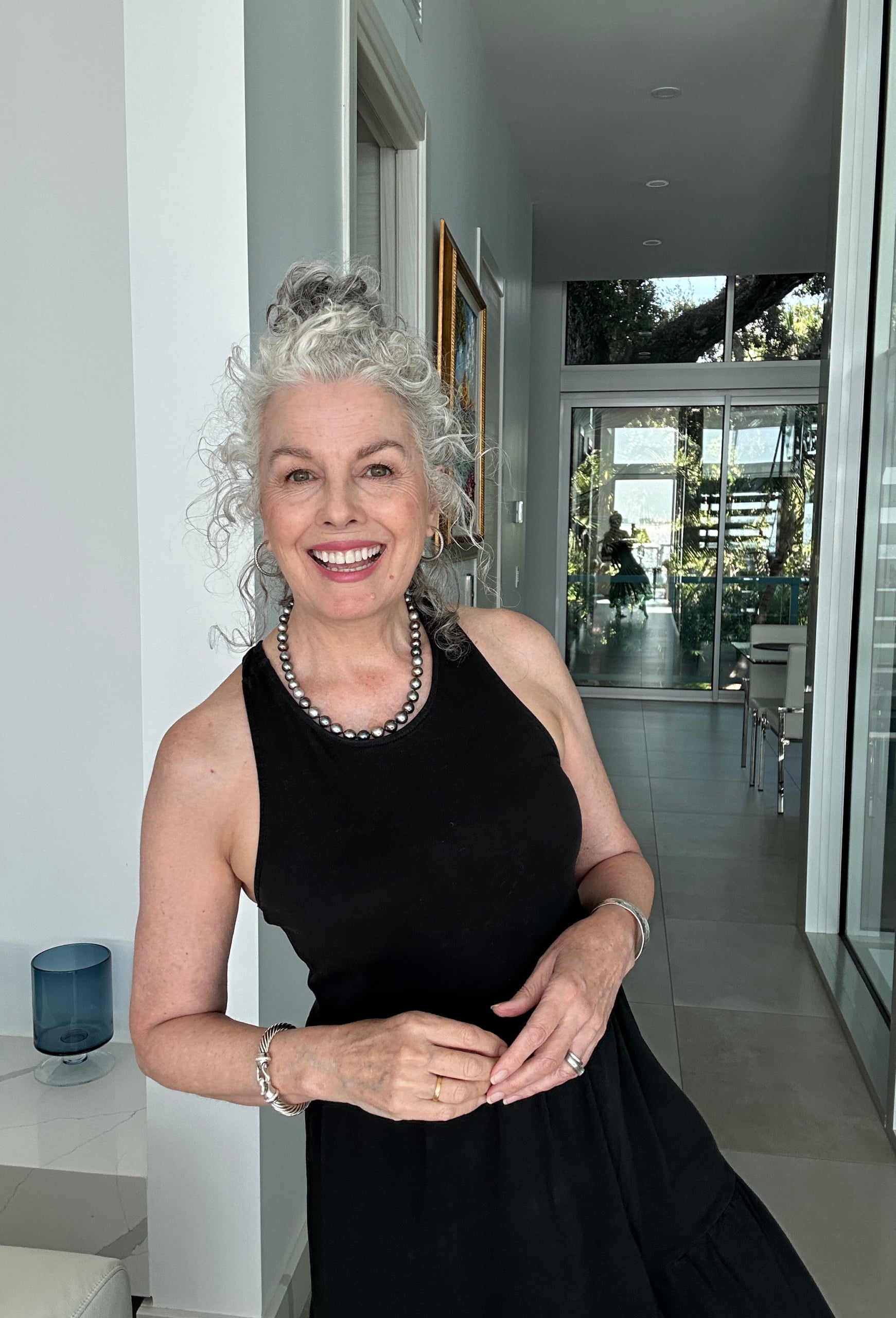 Your gray hair is naturally curly and absolutely beautiful. For those of us with curly hair, can you walk us through your personal curl care routine — including the products you love for defined, frizz-free curls?