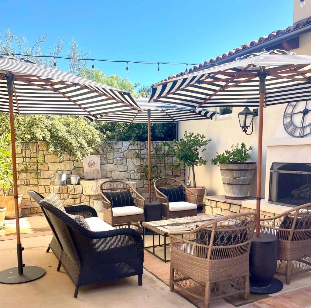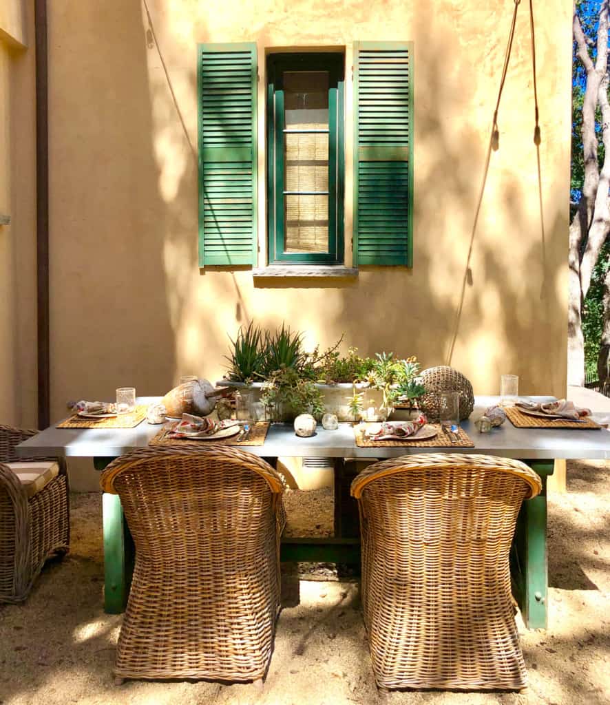 We tried to repeat the colors in the stone, the iron fixtures and the shutters in our “courtyard outdoor living room”. We added the umbrellas from Midtown Umbrellas a couple years ago. This patio would be unusable during the dog days of summer without these umbrellas. We brought the black outdoor chairs from our fixer upper. I may not have chosen black if I were starting from scratch. The sofa and chairs is no longer available. Pillows are from Etsy here. Vintage planters are from Atelier de Campagne. The side tables are no longer available but Pottery Barn has very similar ones here. Steve drilled holes on the top and bottom and inserted the umbrellas and stands. You can read more about that in this post 10 Ideas for Creating an Inviting Courtyard Oasis here.