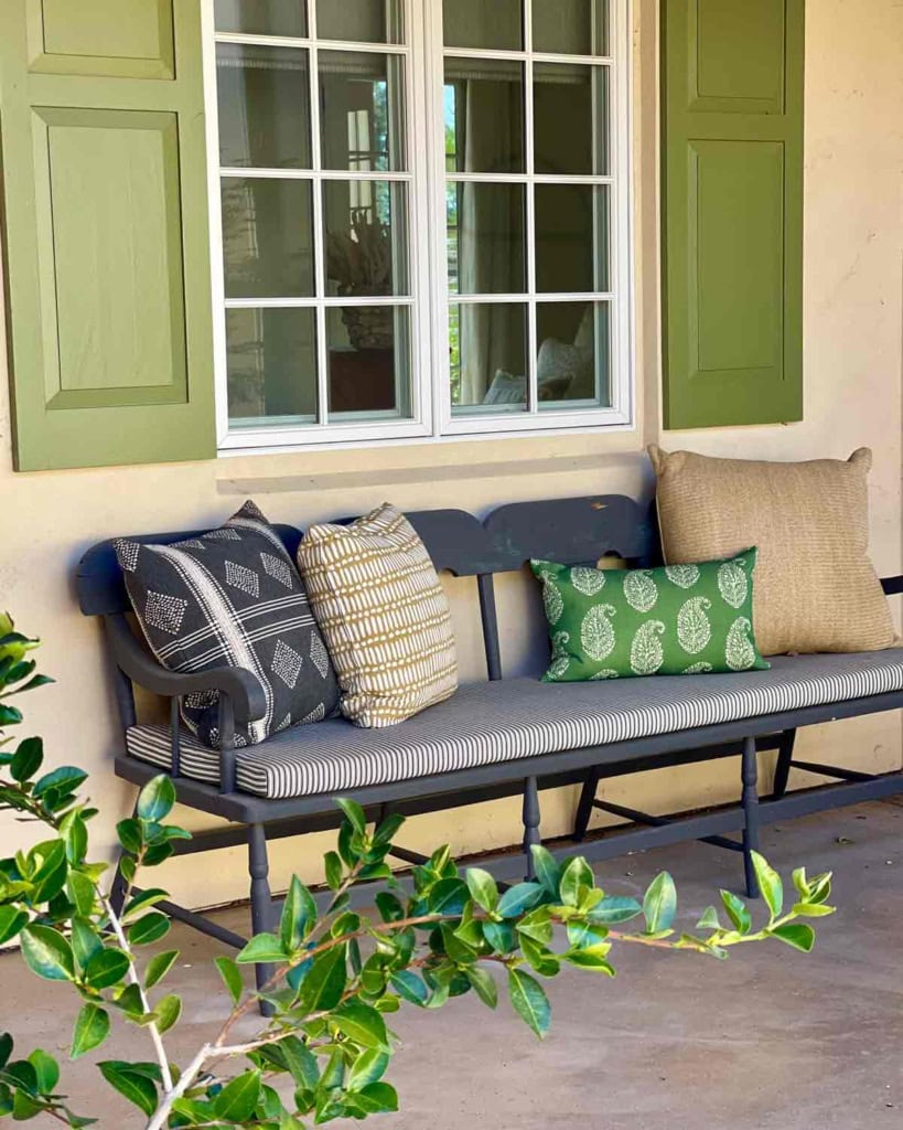 The perimeter of our courtyard is covered so we were able to incorporate a few antiques for character. Pillows from left to right, black and white, tan and white, green and white, and faux jute.