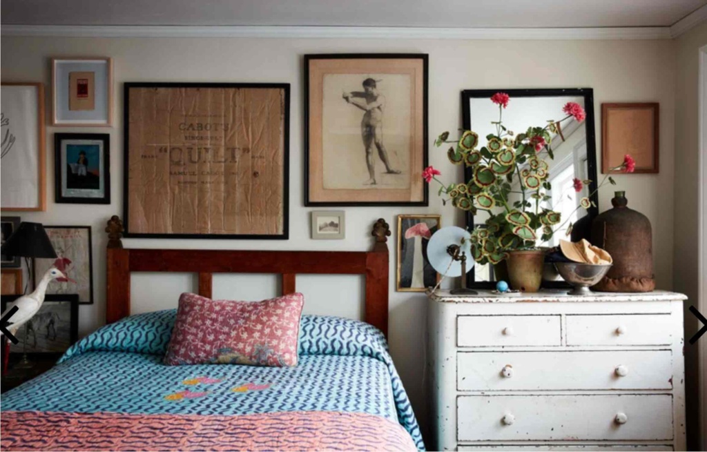 I love the curated assemblage of antique and vintage prints in timeworn frames in this bedroom gallery wall.