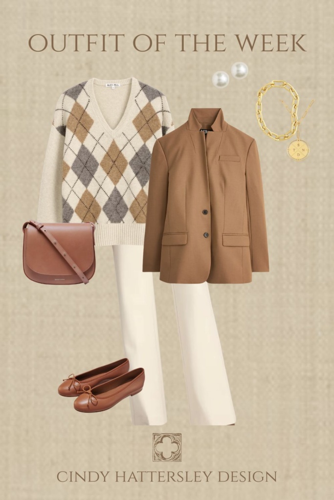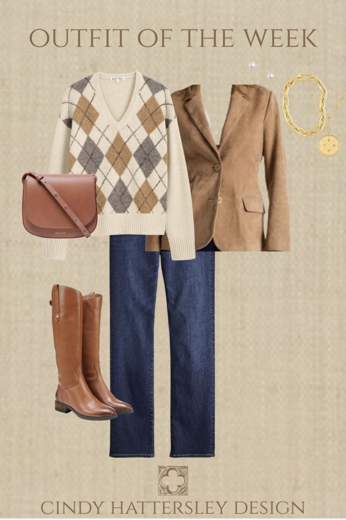 You can find a less expensive crossbody from Quince here, and a more price friendly argyle sweater option here. I am guessing you can shop your closet for the rest!