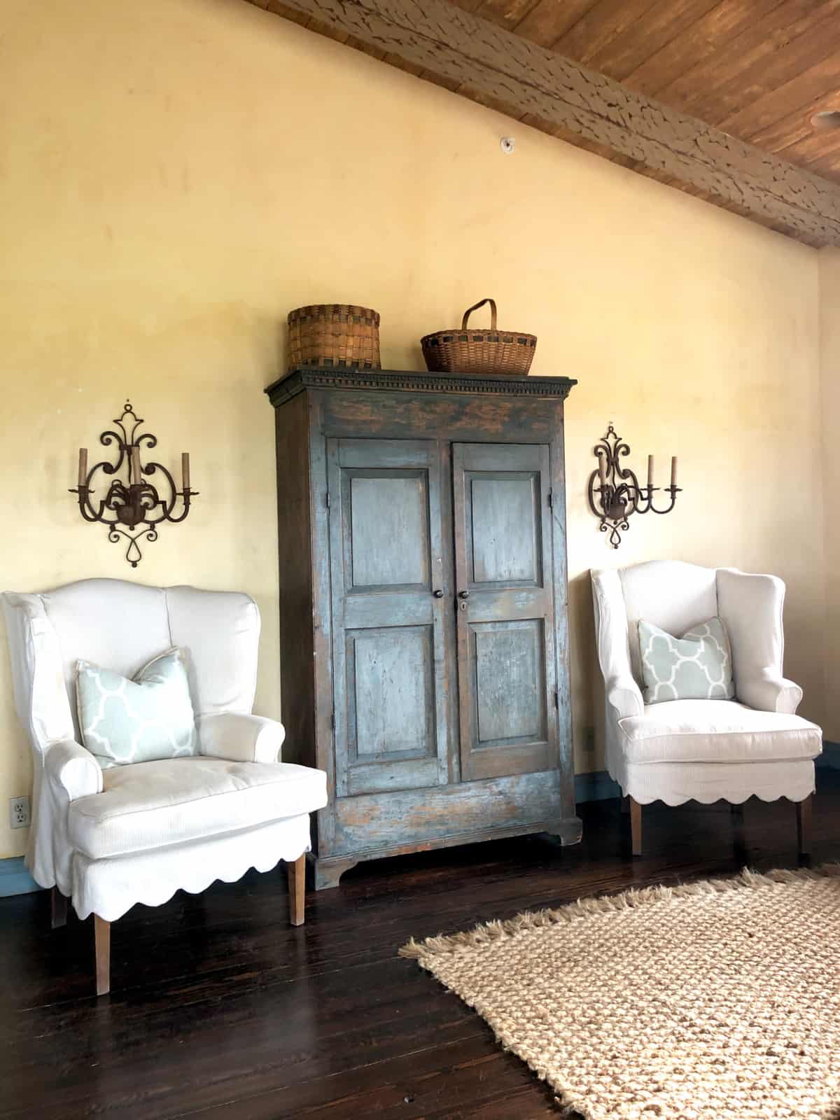 Most of my accessories are one of a kind that I have sourced from antique shops, flea markets, Etsy and eBay. The coffee table came from Dovetail (no longer available). The chair was a junk shop find that was recovered. The loveseat is lee industries from at least 15 years ago. The wing chair was a junk shop find in it’s second recovering.