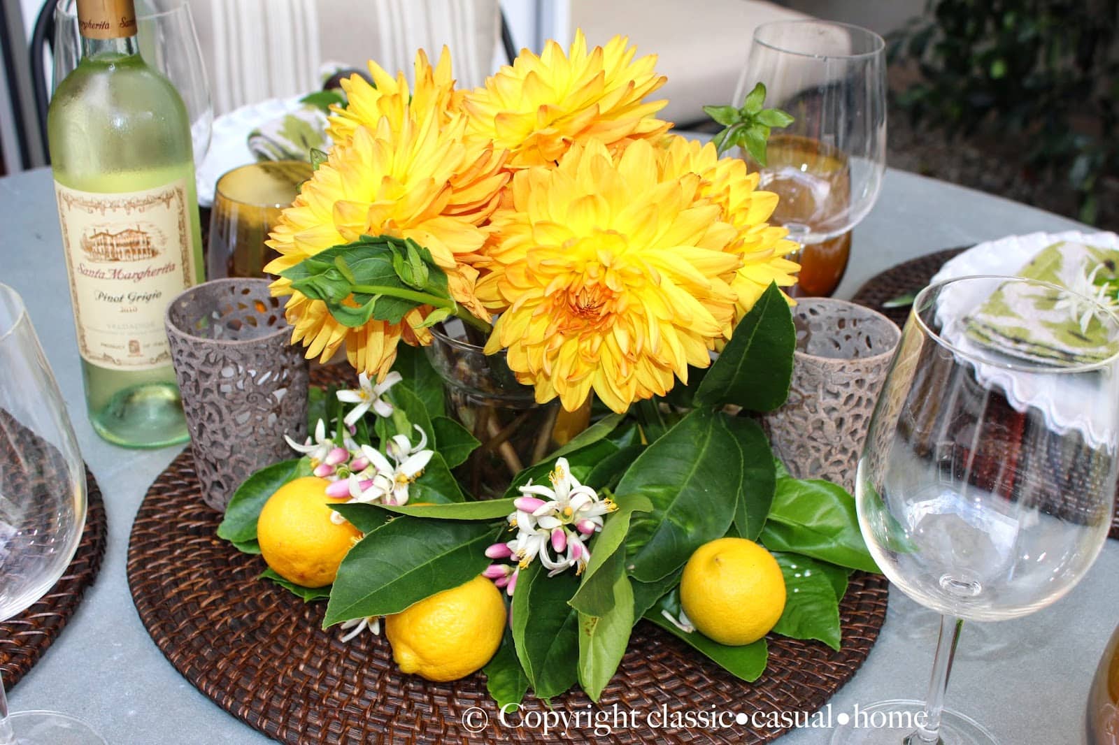 Mary Ann said that this table setting reminds her of my daughter’s wedding palette. I love how she combined these gorgeous dahlias with the lemons and leaves. What could be better than sitting at this gorgeous table with a crisp glass of Pinot Grigio!