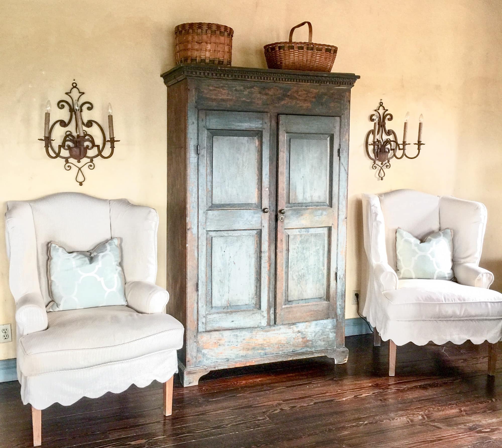 On the adjacent wall is a beautiful American Kas (owned for 25 years) in original blue paint (a gift from Steve’s generous brother and sister-in-law years ago for building their house). Next to the Kas, I switched out the pet pics (moved them elsewhere in the room) with the Mexican iron sconces that were on either side of the bed before the curtains were there. I didn’t change a single piece of furniture other than the Parsons chair on the right slipcovered in an indoor-outdoor fabric found on Ebay. You can read my post about the transformation of this chair in my post “Project Design Exceptionally Clever Chair Makeovers”. The chair was hideous!