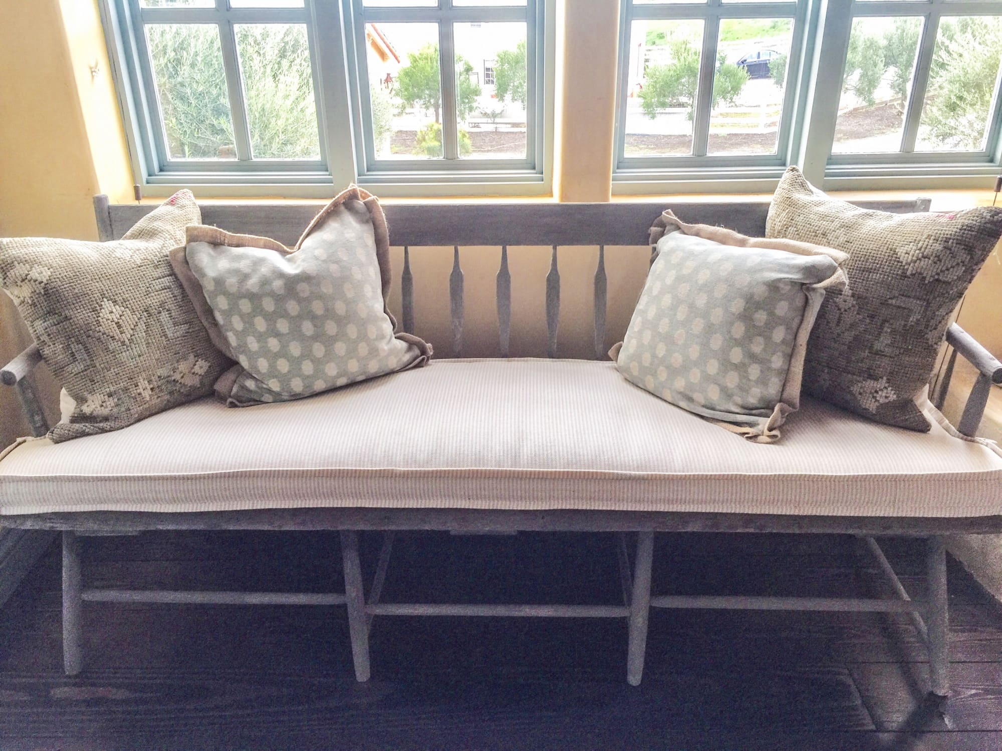 Notice the odd space to the left of the fireplace. I never could quite get that right. I finally dragged in a bench (that I had out on my balcony) and placed it there. Always shop your own home before buying something new. It is amazing sometimes how moving a piece to a different room, or repurposing it can change the overall look. I had Yvonne make a cute cushion in the same stripe fabric (yes I bought tons!) and added my favorite small flange detail. The kilim pillows came from Etsy and the blue and white polka dot are Jane Churchill Soleo with a jute flange. This fabric was a splurge but I only needed a yard and a half.