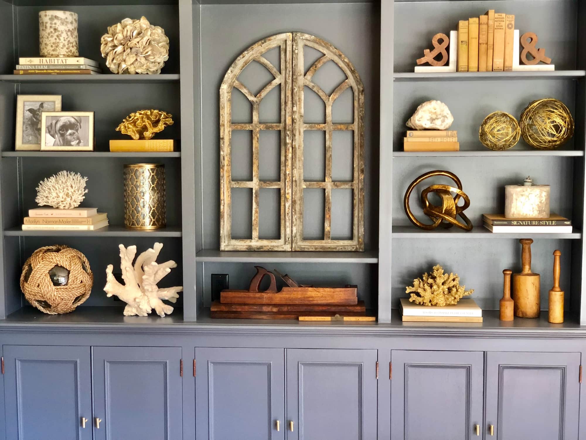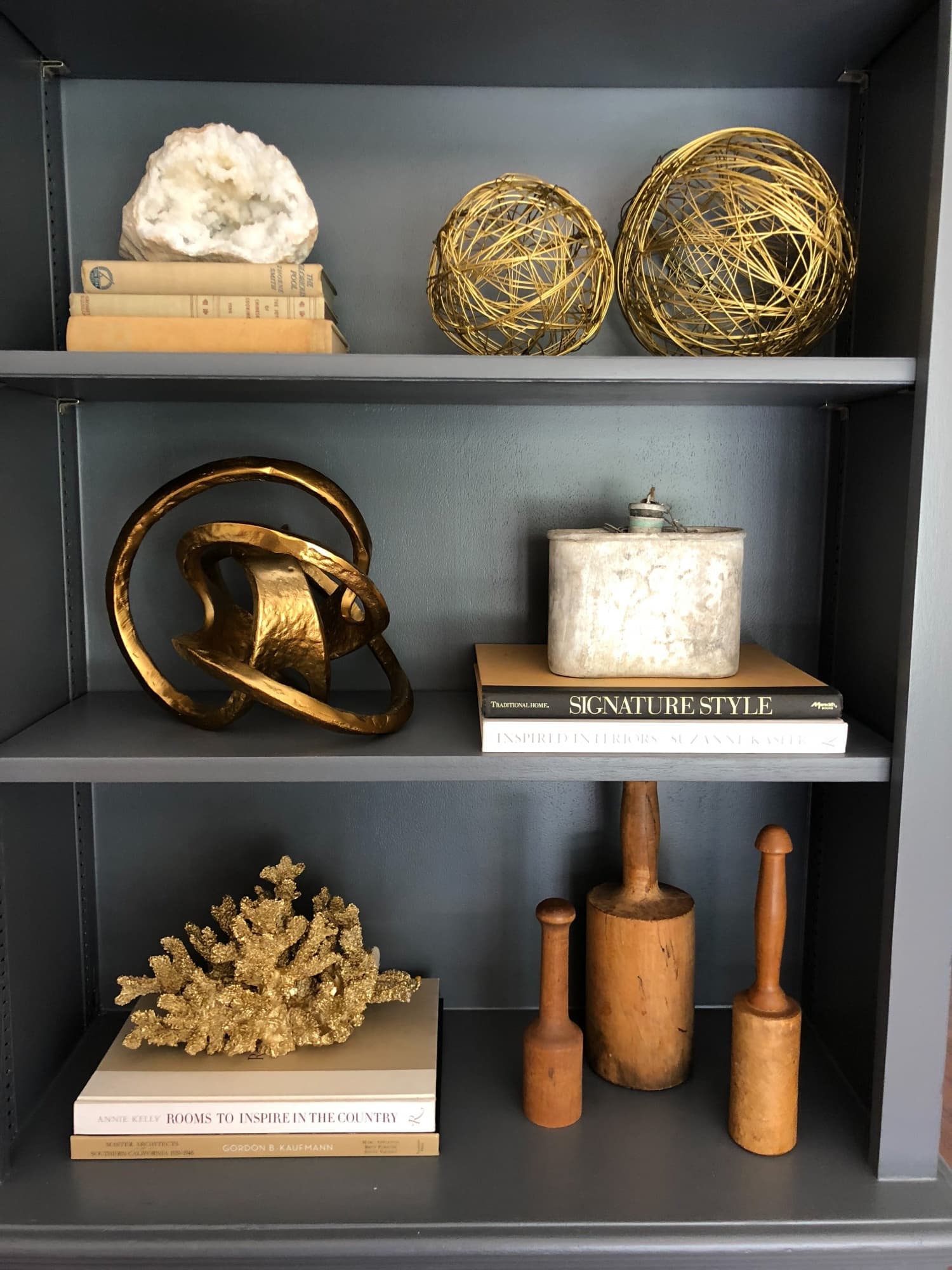 Due to the dark blue/gray/black of the cupboards, I chose neutral and brass accessories to contrast the dark color of the cupboards. If your shelves were light you should add darker objects to add depth.