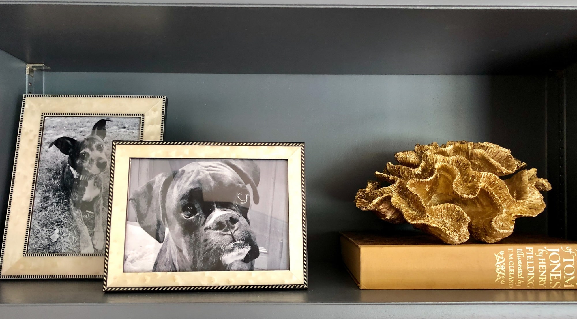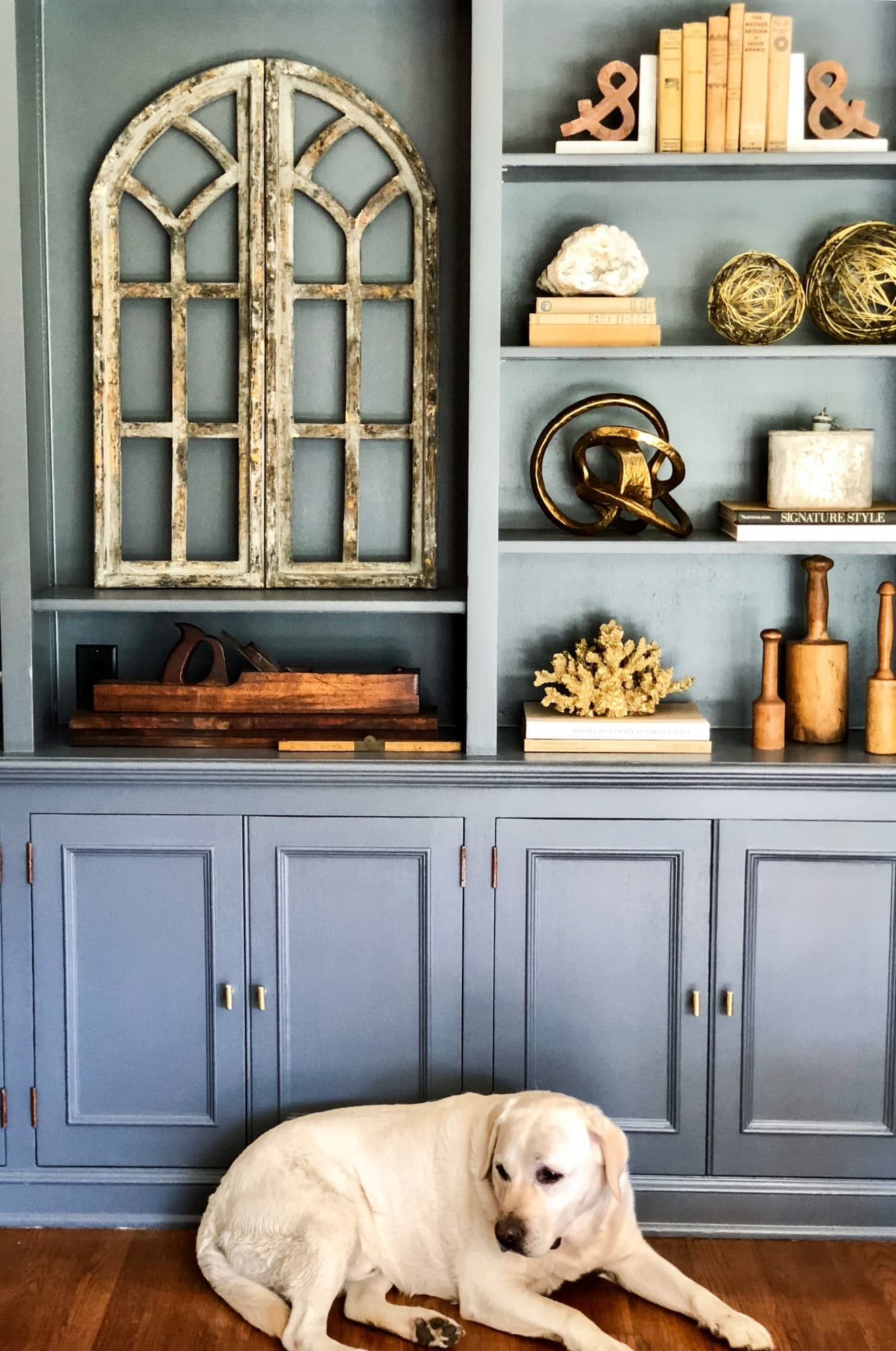 Cindy….Cindy….Cindy….first of all dog love! Second…..I love the color of those bookshelves and the wood tones with it. Perfect combination of books….objects….and whimsey! Loved being a part of this series so a huge thanks for adding me:)
