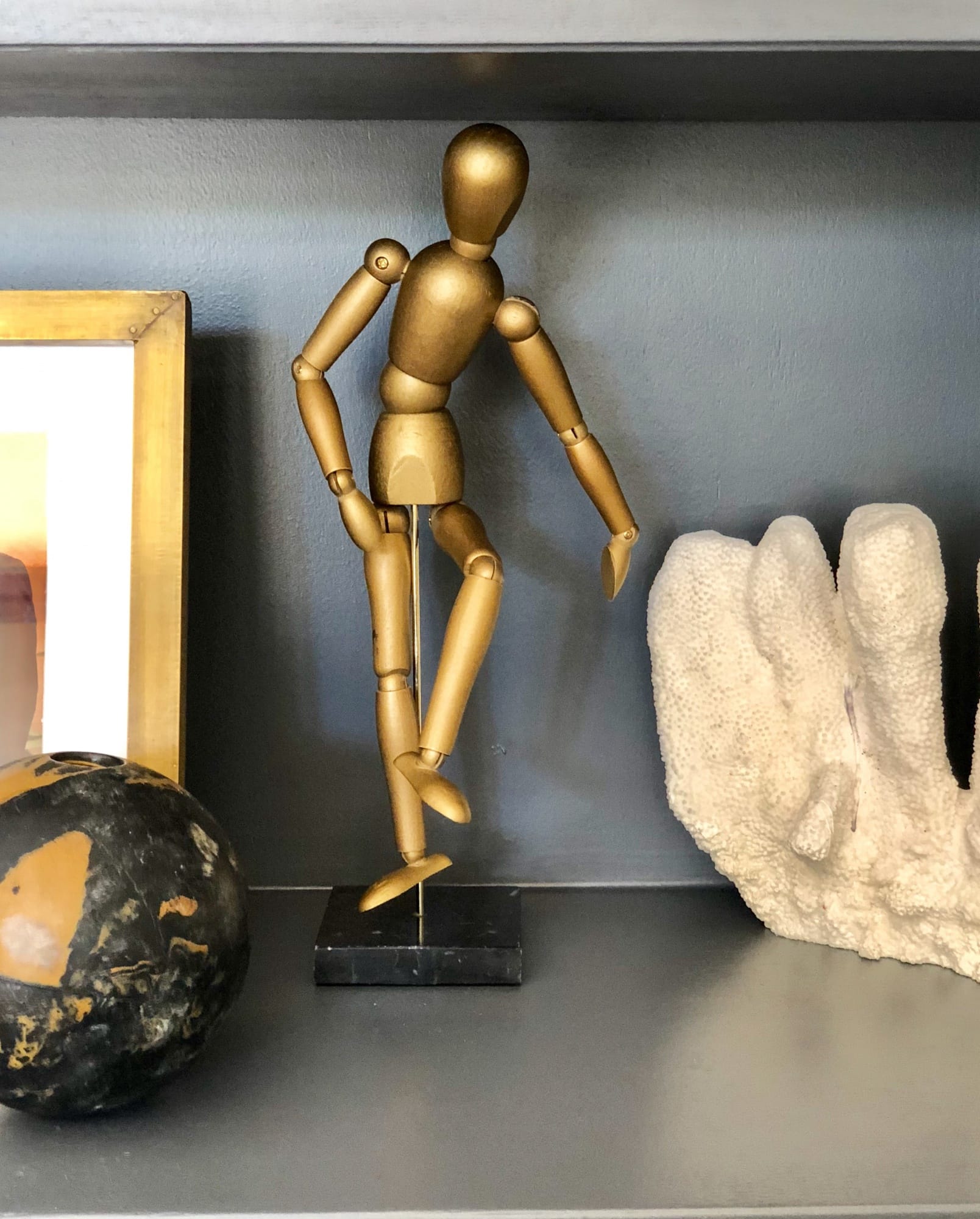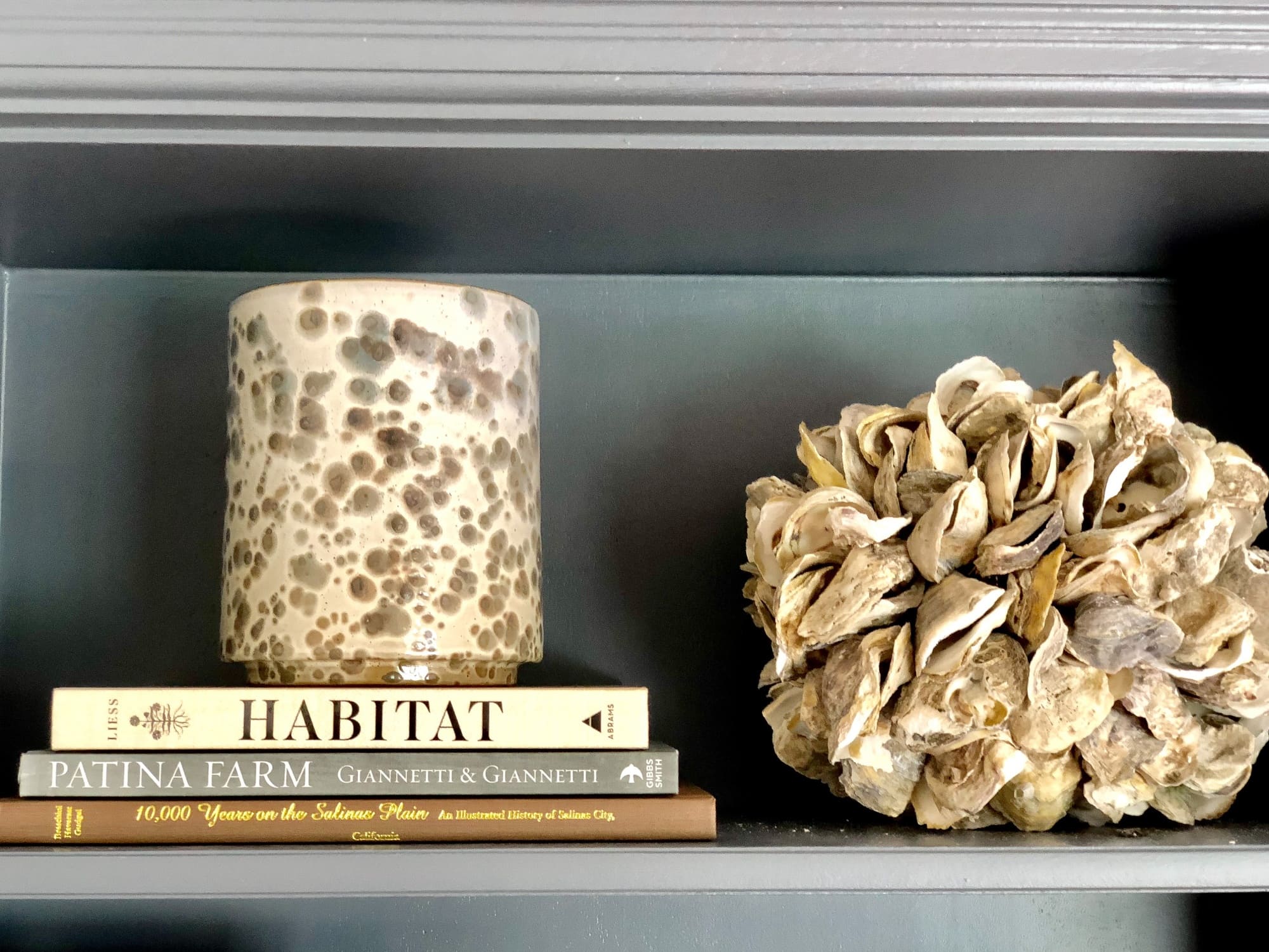 Every shelf here has something old or something that looks old. On the first shelf old books are mixed with brass spheres from Home Goods, and a piece of agate from Home Goods. The second shelf has a new brass sculptural sphere from Home Goods and a faux vintage flask from Refinery in Paso Robles. Third shelf old wood meat tenderizers, mixed with faux gold coral and design books.