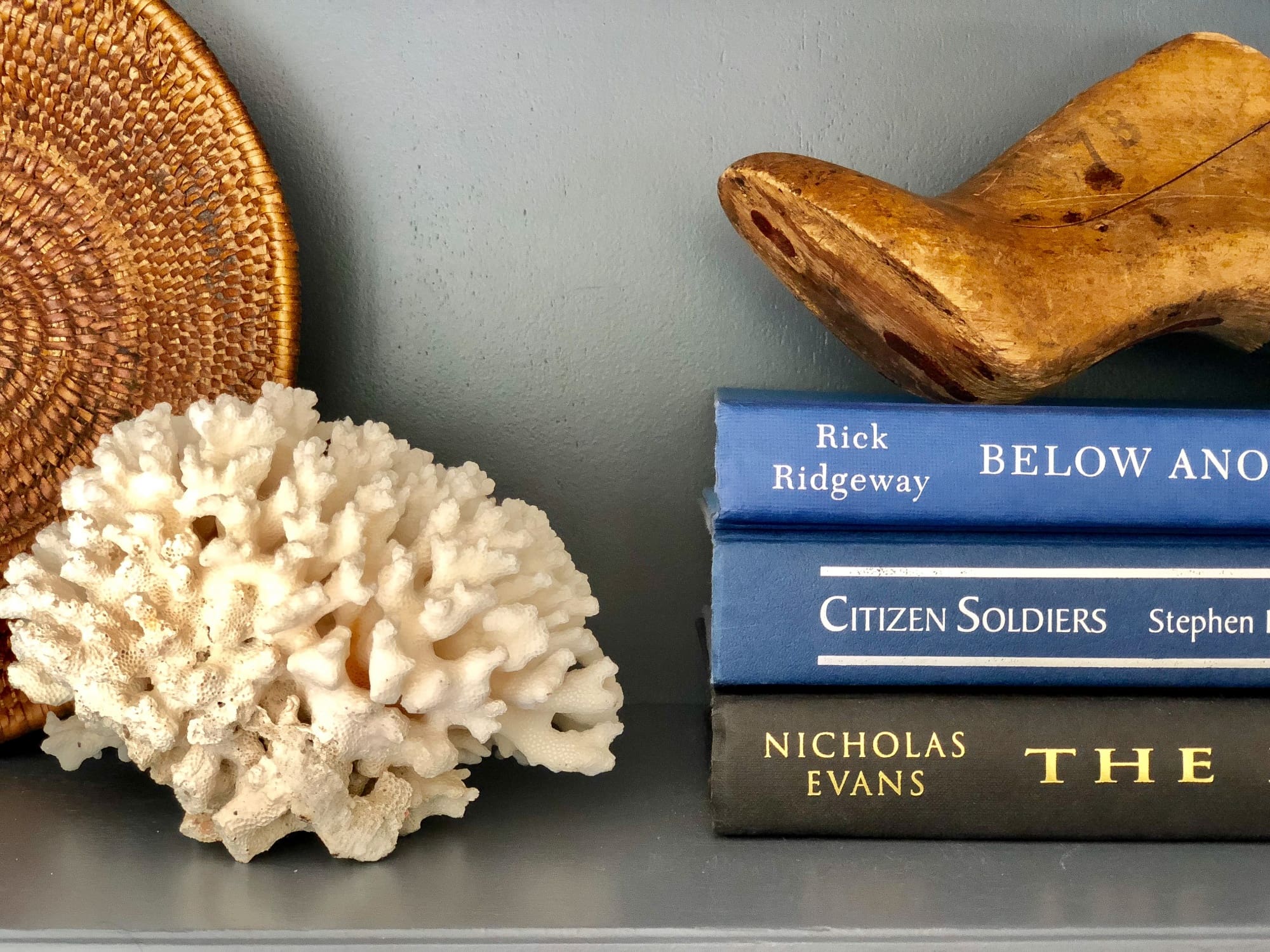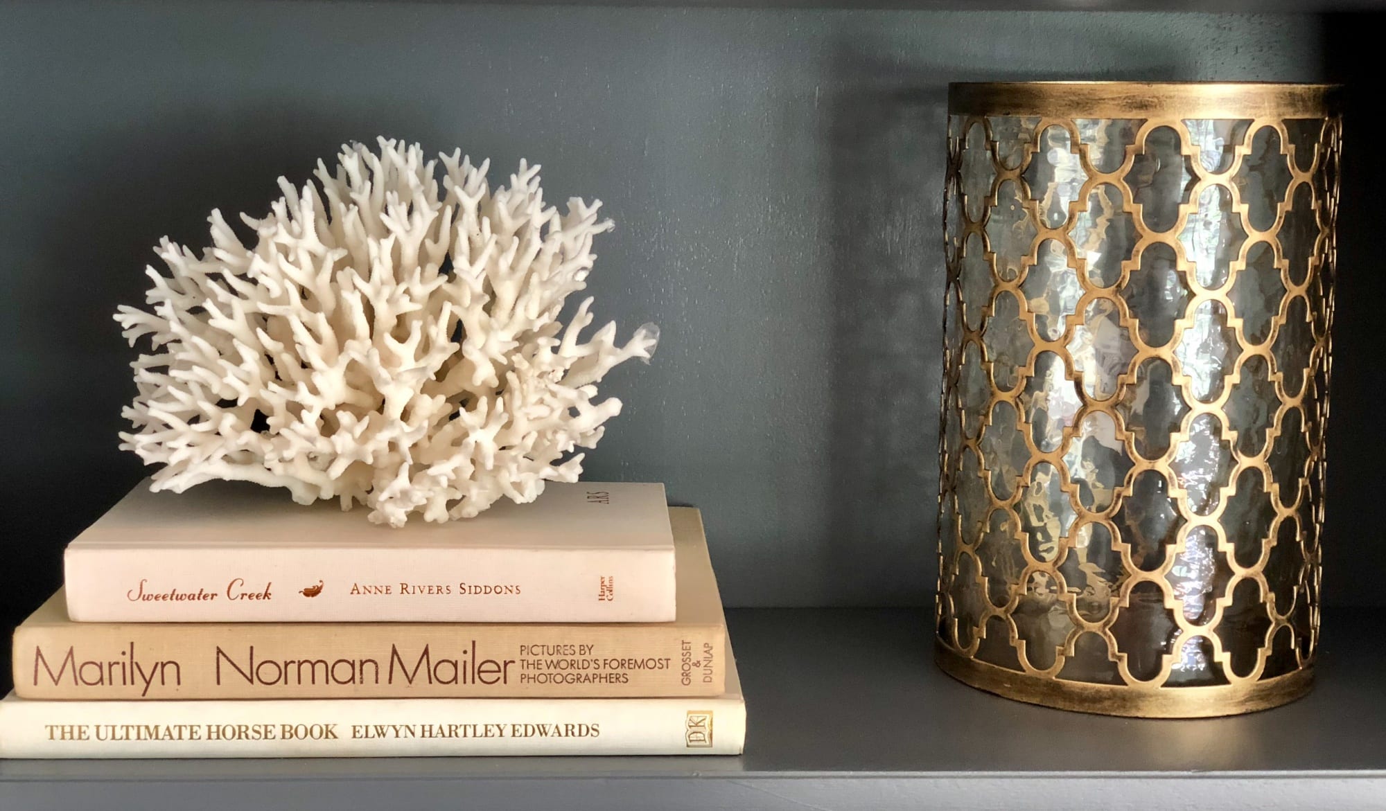 In this particular bookcase, I have used coral, agate, and rope for my natural elements. You could use plants or flowers (I would kill them. ) Natural items tone down the new factor of store-bought items