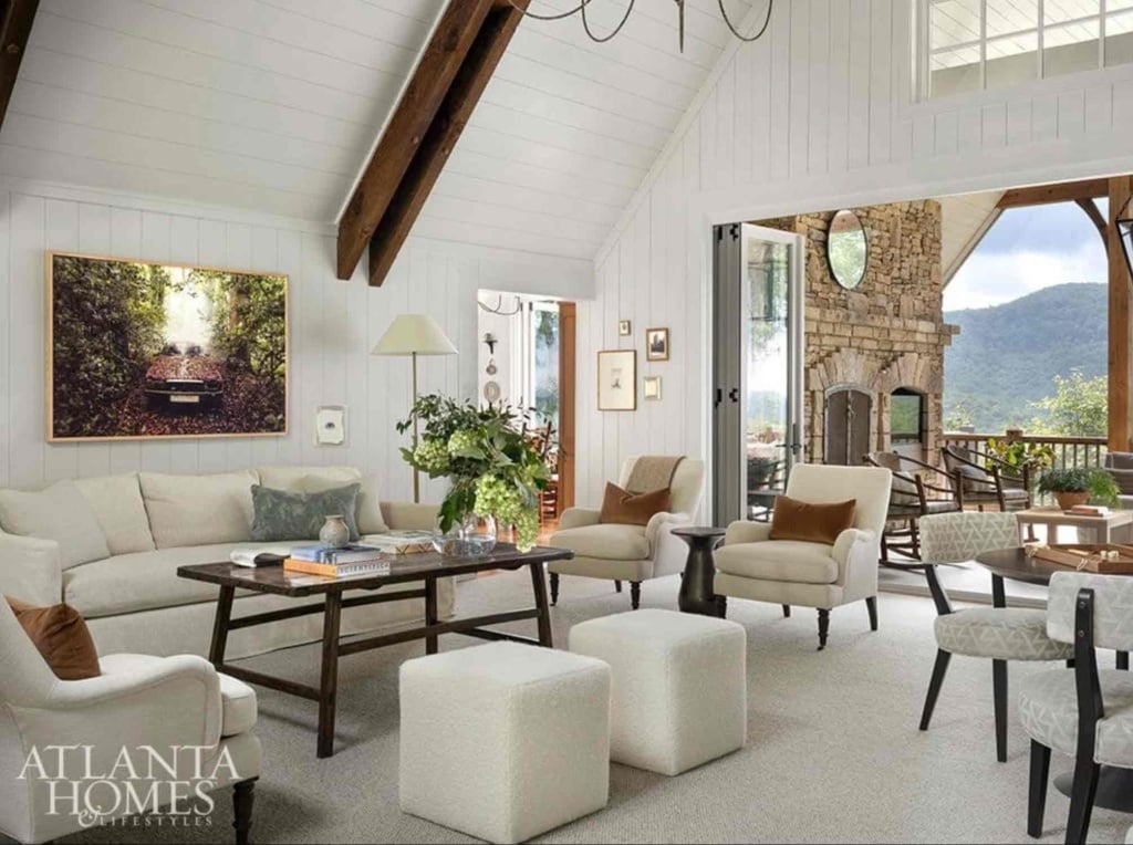 I’ll admit I get a little obsessed with mountain homes this time of year. This Highlands beauty (featured in Atlanta Homes and Lifestyles, designed by the dream team of architect Stan Dixon and designer Betty Burgess, and photographed by Rustic White, is a masterclass in light, texture, and timeless style.