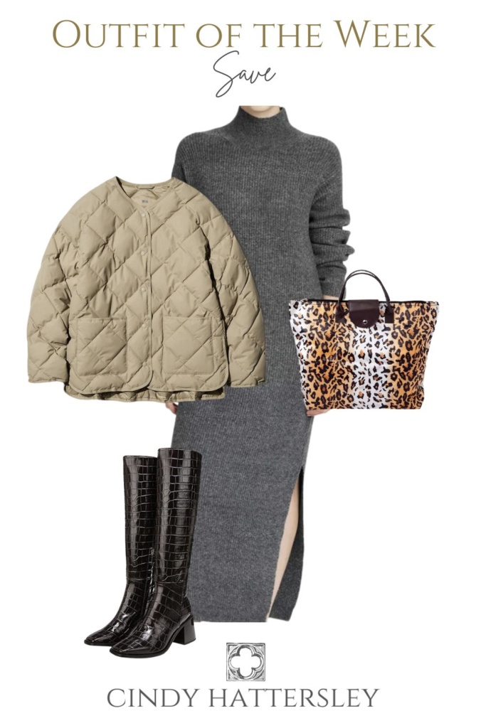 This Target sweater dress is great looking and also comes in extended sizes. I love this quilted jacket from Uniglo and it comes inseveral other colors. The expandable leopard tote is a Longchamp dupe from Target. The boots by Sam Edelman are reasonable and oh so chic!